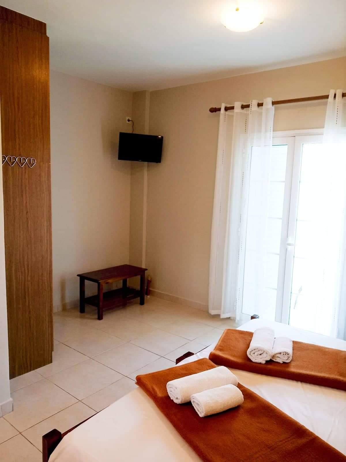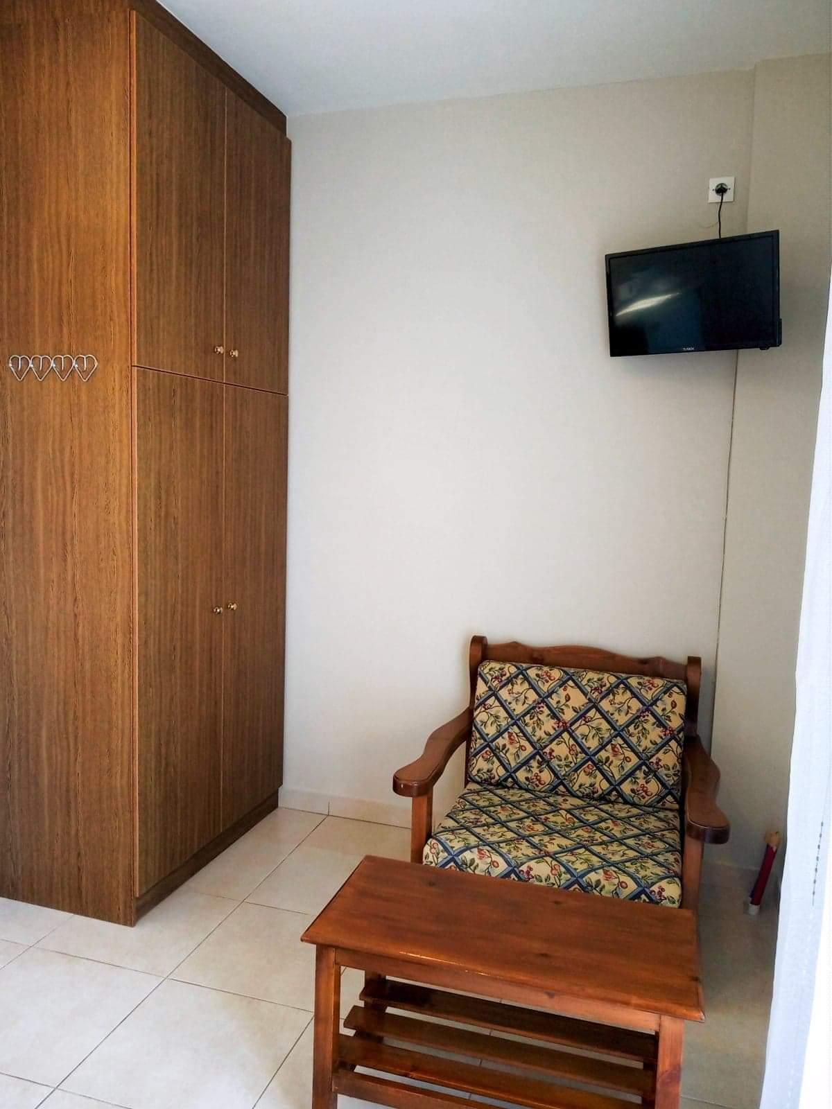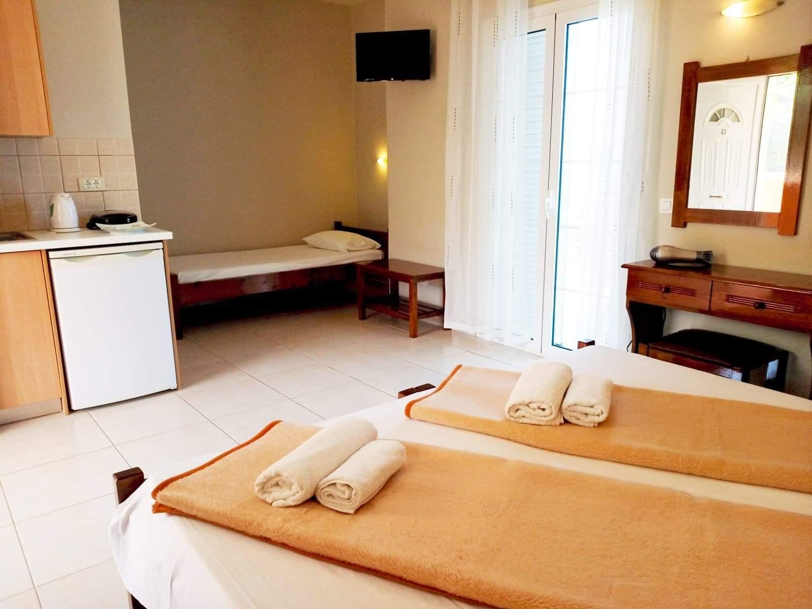 This studio is an open plan apartment, consisting of a sleeping/living area with two single beds or one double bed, private bathroom with a shower, fully equipped kitchenette (with two hotplates) and a private balcony or terrace overlooking the Ionian sea, the sunset and the area of Palliki Peninsula as well as the coastline of Kefalonia. There is also a sofa bed that can host a third person.