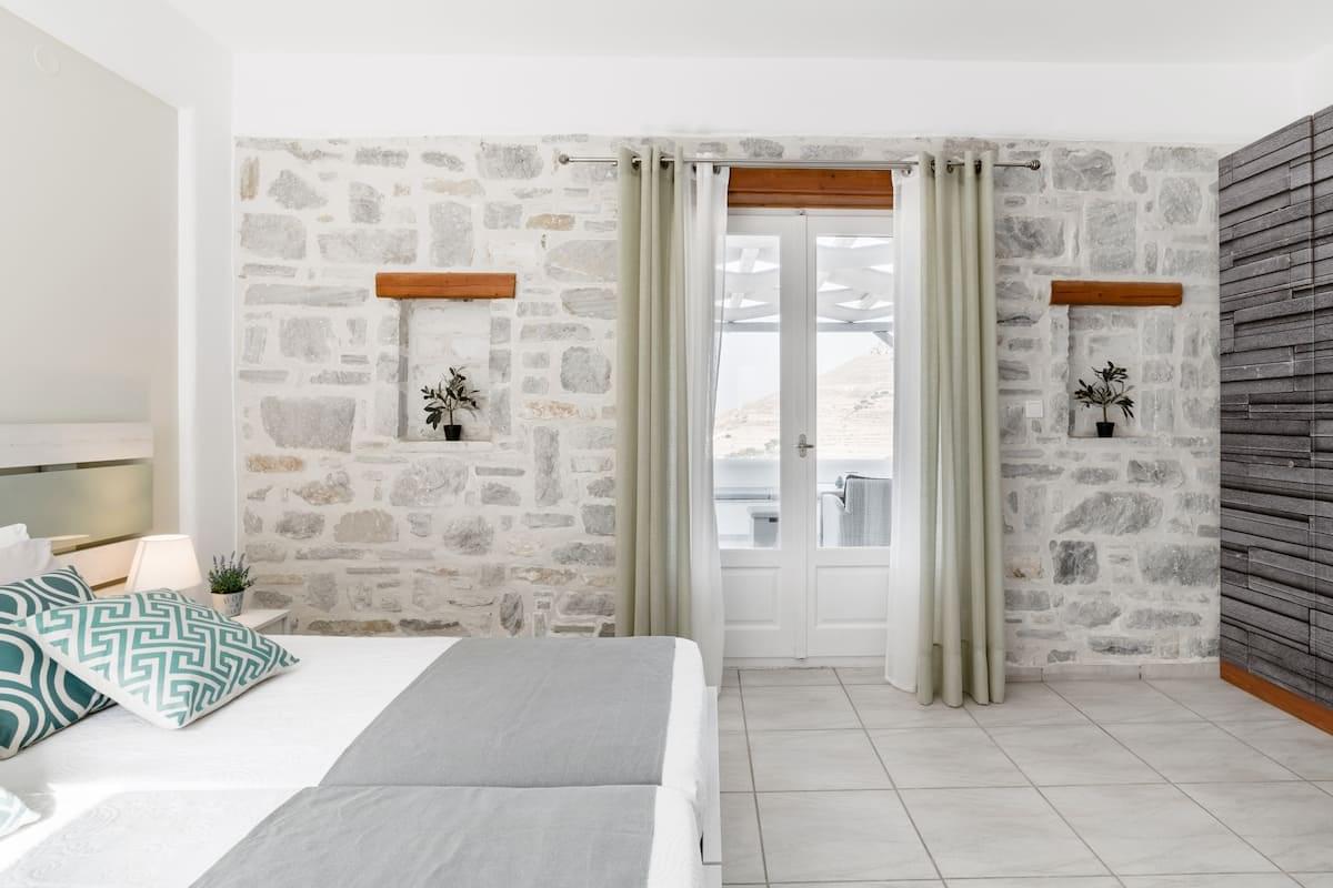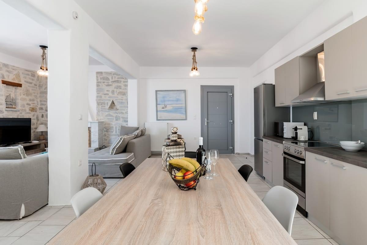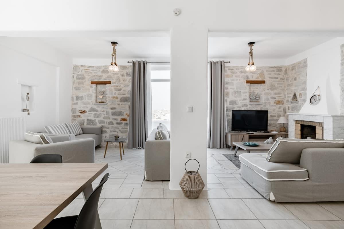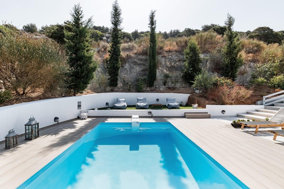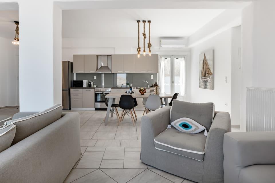 Villa Amphitrite: It consisting of a big living room with two sofas and a coffee table, a dining table, and a fully equipped open plan kitchen. There are two bedrooms, one with a double bed and the other with two single beds or one king-size double bed, two bathrooms, and one WC. The terrace has an outdoor sitting area at the front with built sofas and an unobstructed sea view. Amphitrite is 120m2 with a private swimming pool and can accommodate up to 7 persons (4 adults and 3 children).