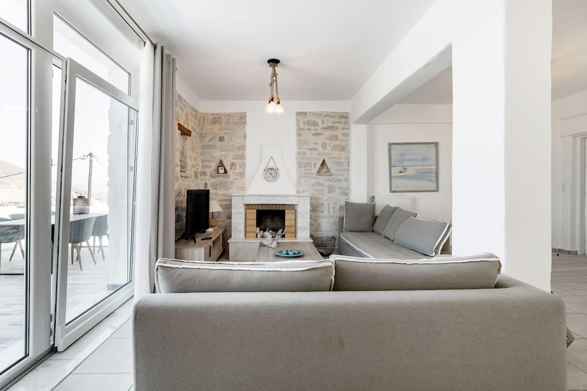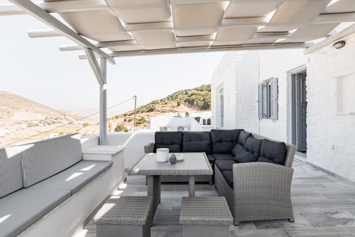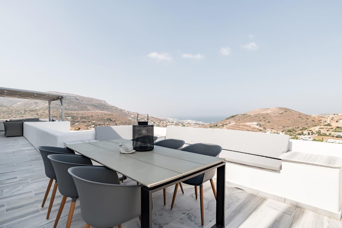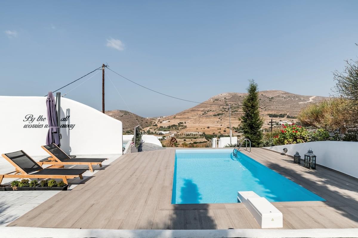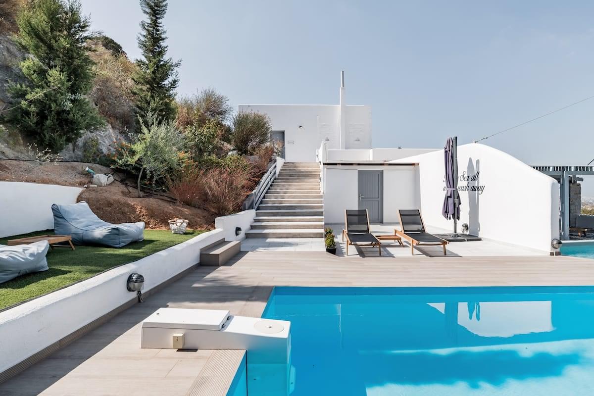 The outdoor space features pergolas with dining tables, three swimming pools, and BBQ. Also, offers great views of the sea and the island’s landscape.