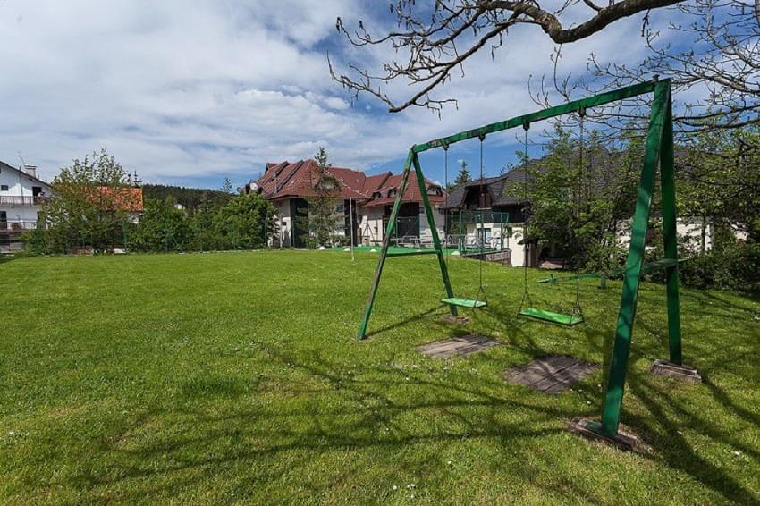 The property features a large and spacious yard covered with green grass, with swings and a seesaw that will delight the youngest guests. Adults can relax on comfortable seating sets in the shade of a large walnut tree or under umbrellas.