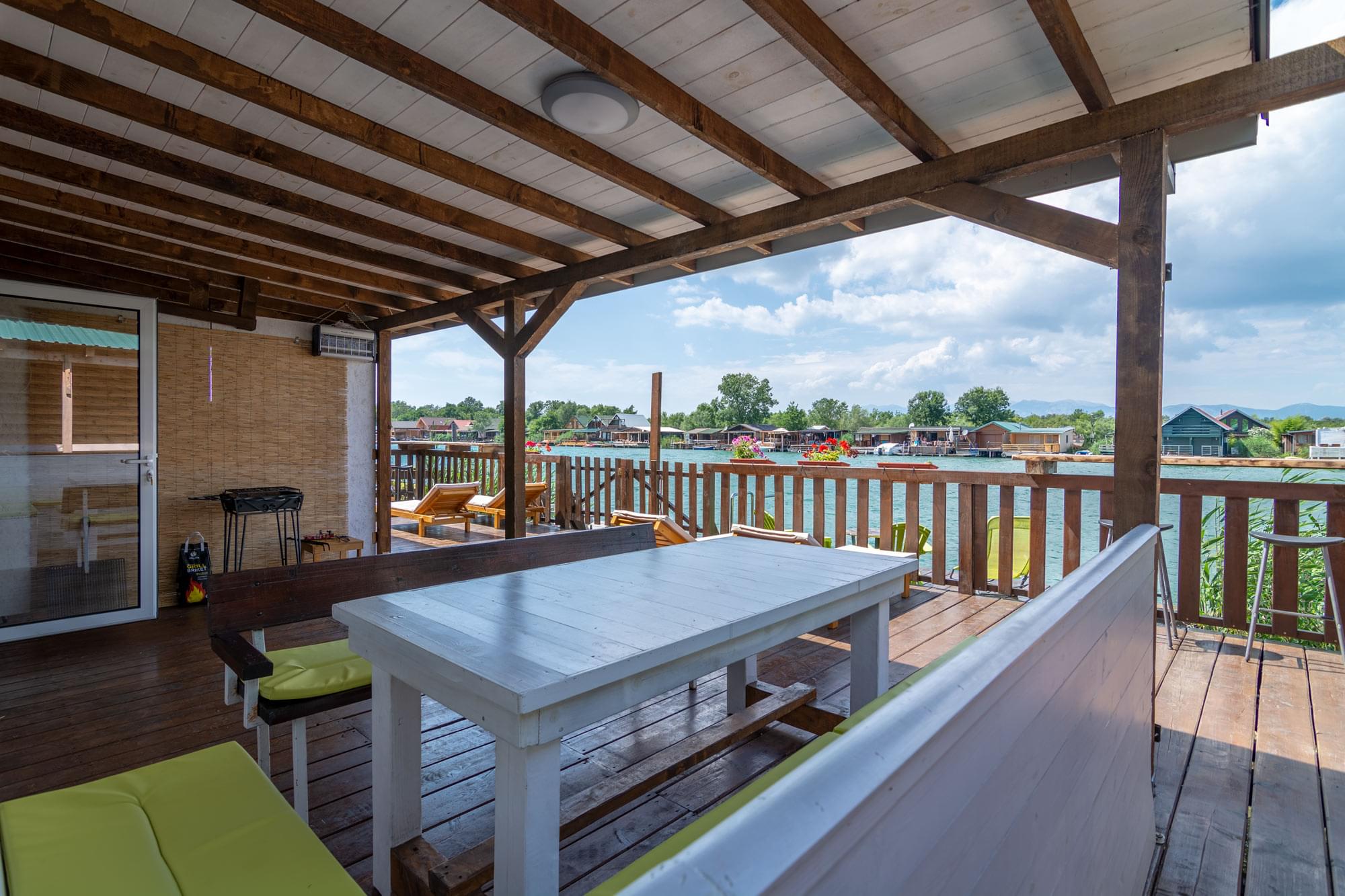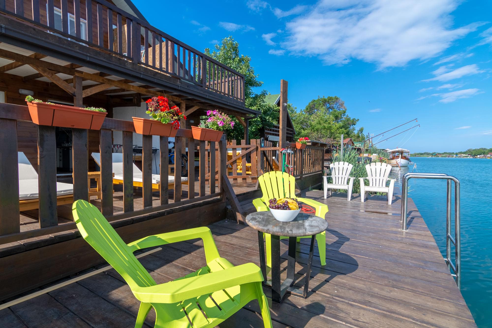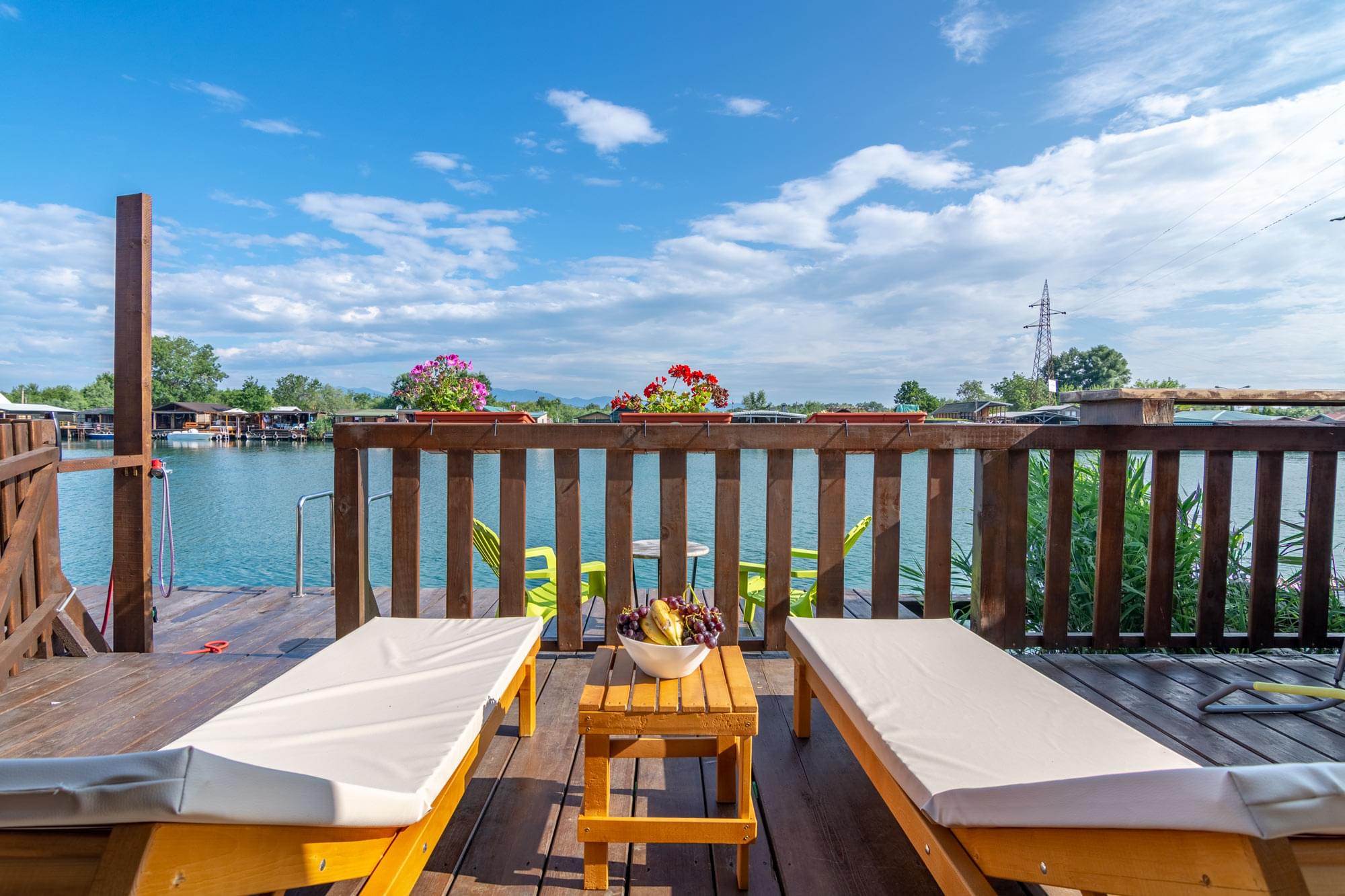 Hakuna Matata is luxuriously equipped two-story house with two separate apartments, located on the left bank of the river Bojana, on Ada Bojana island, downstream from the bridge 150 meters. Every room in the house has an air conditioning. Both apartments on the ground floor have living room, kitchen, bedroom and bathroom. The kitchens are fully equipped with inventory and appliances (dishes, stove, oven, fridge, dishwasher machine). Living rooms are connected to a covered terrace furnished with outdoor furniture, sun loungers, grill, bar.. Covered part of the terrace leads to the lower deck level for sunbathing with deck chairs and direct stairs for entering the water.