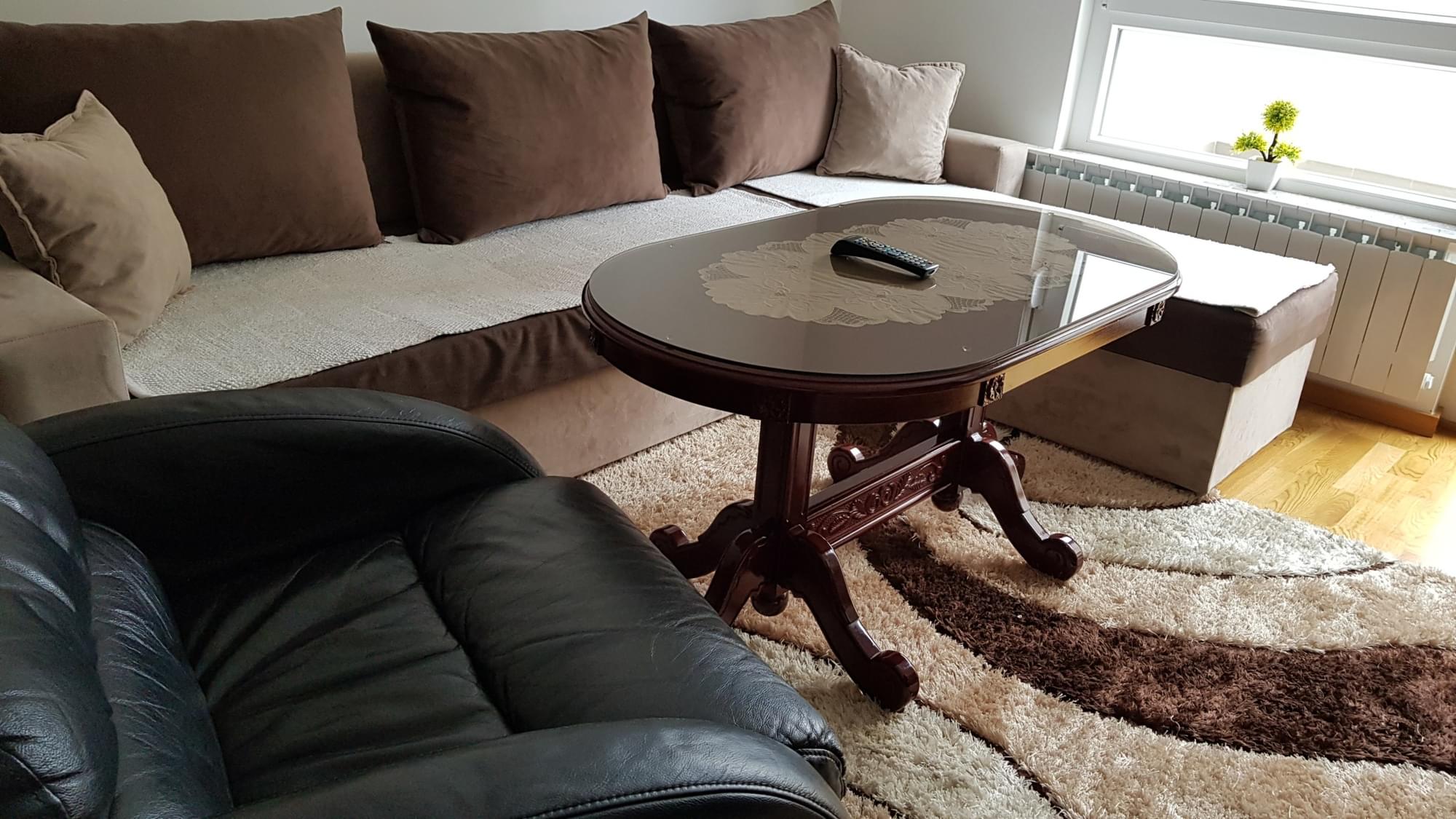 U dnevnom boravku je ugaona sofa koja se može razvući da komotno spavaju dvije odrasle osobe. Sto i komoda su iz kolekcije stilskog namještaja Haznadarević. A za potpuni ugođaj tu je i veliki LCD TV.