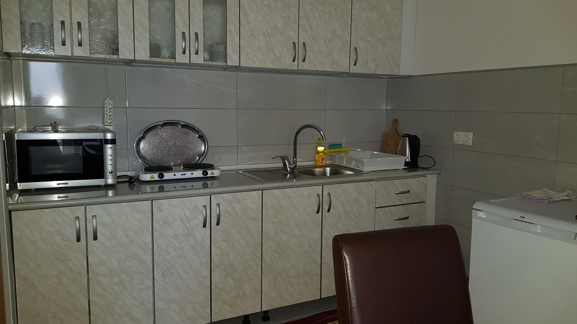 Kuhinja je opremljena sa frižiderom, kompletnim kuhinjskim posudjem, mikrovalnom, kuhalom za vodu i rešoom za kuhanje. Tu je i trpezarijski sto i stolice.
