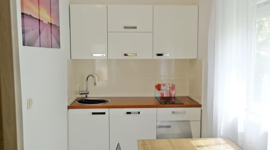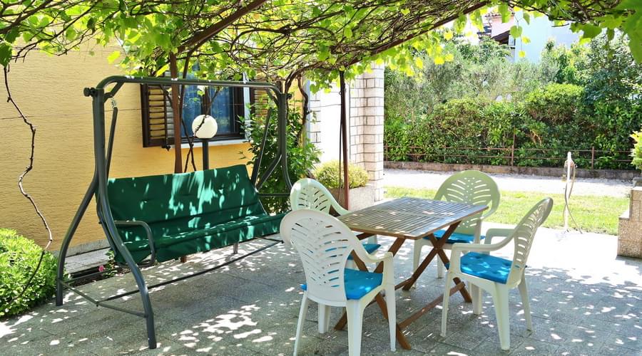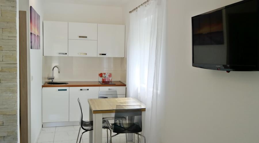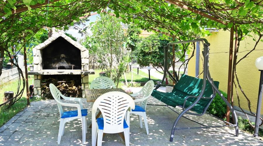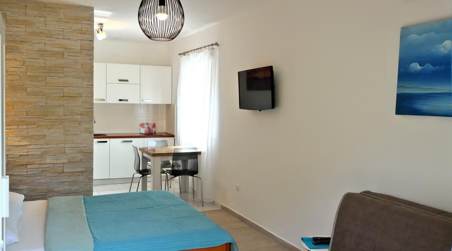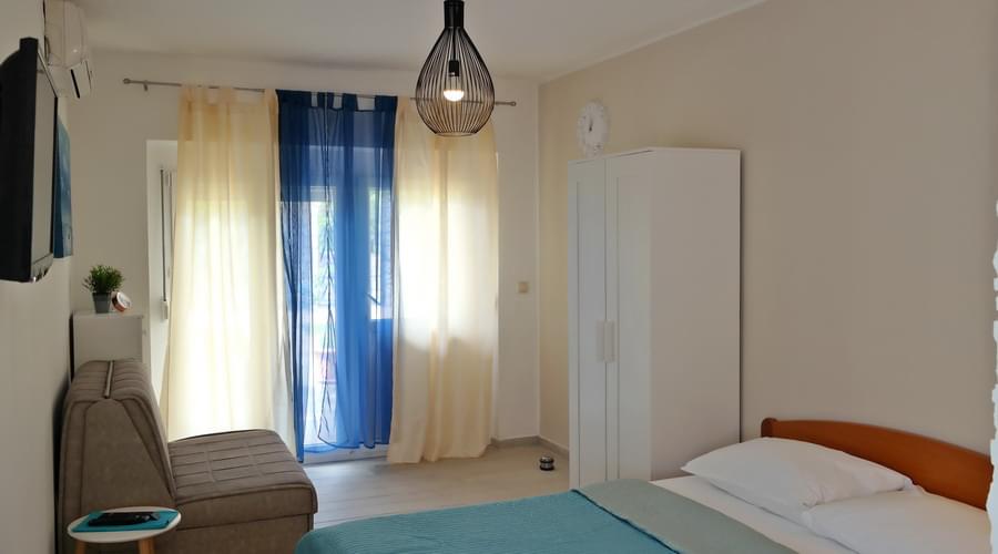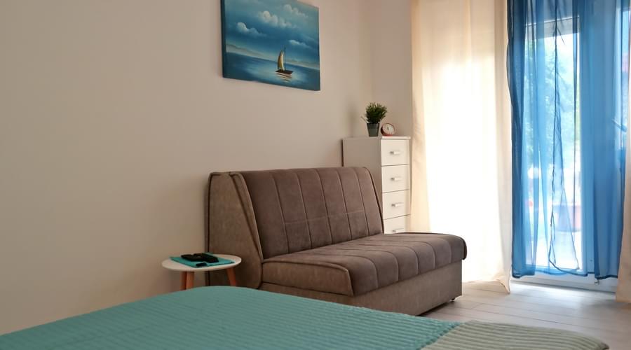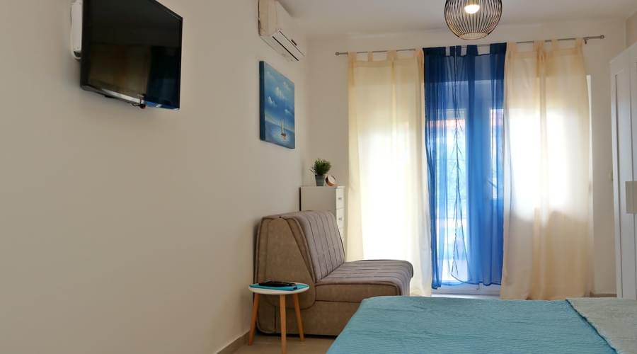 Apartment studio for 2+1 persons, 25 m2. Apartment is situated on ground floor and includes: kitchen (completely equipped with electric stove, kettle, fridge and small freezer), bathroom with shower, bedroom, big terrace, Wireless Internet, parking near apartment, sat tv, air-condition, grill. 1 double bed for 2 persons and couch for 1 or 2 persons (1 adult person or 2 children). In price included weekly change of bed linen, towels, wireless Internet and final cleaning.