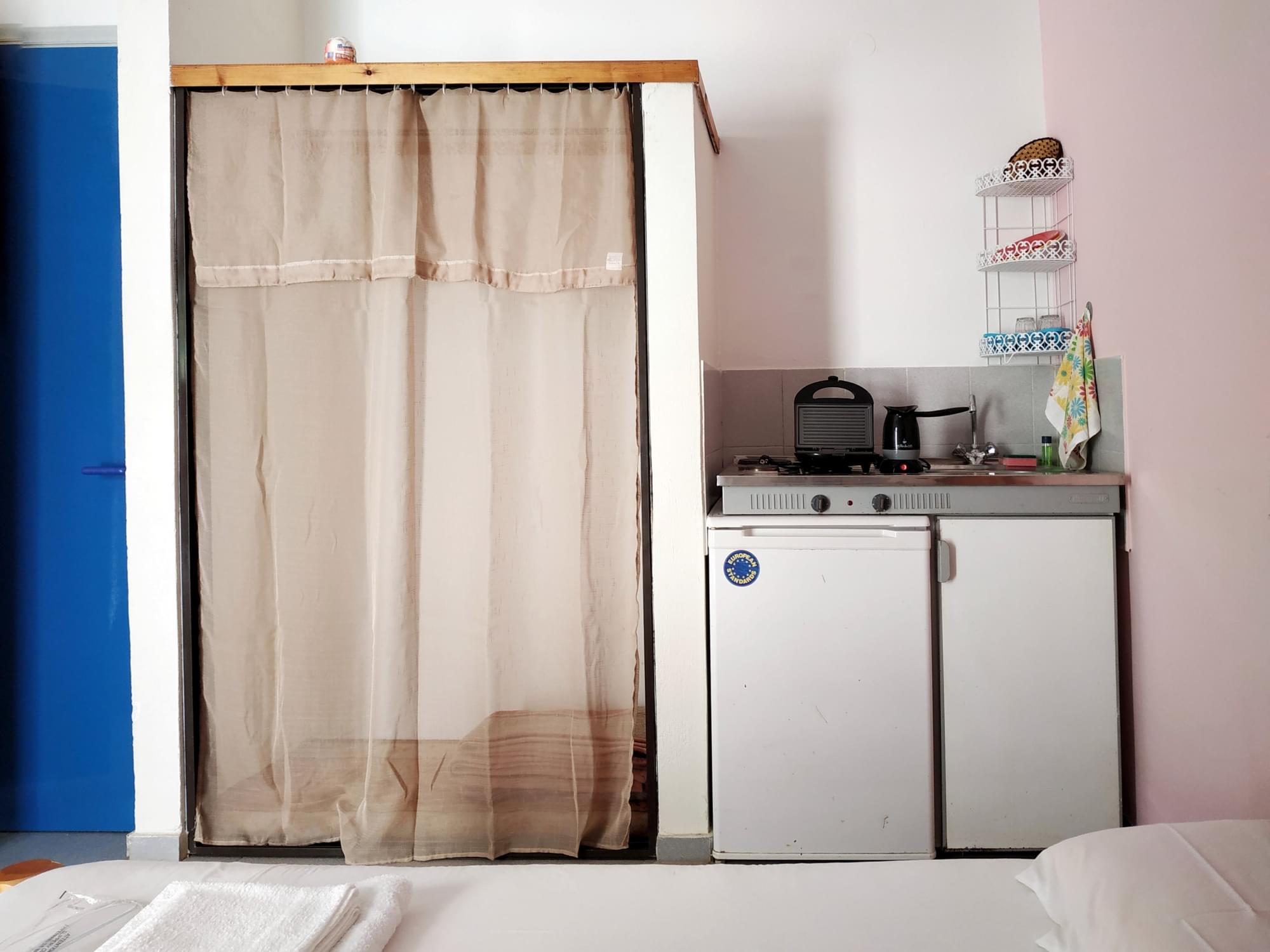 1-2 Person studio Economy is a private room (non shared), with private bath/ toilet with hairdryer. You may prepare your food at the kitchenette including refrigerator & cooking hobs, cooking pot, eating facilities (plates/ forks etc). More electric equipments are toaster, water kettle, electric coffee pot for Greek/Turkish coffee.