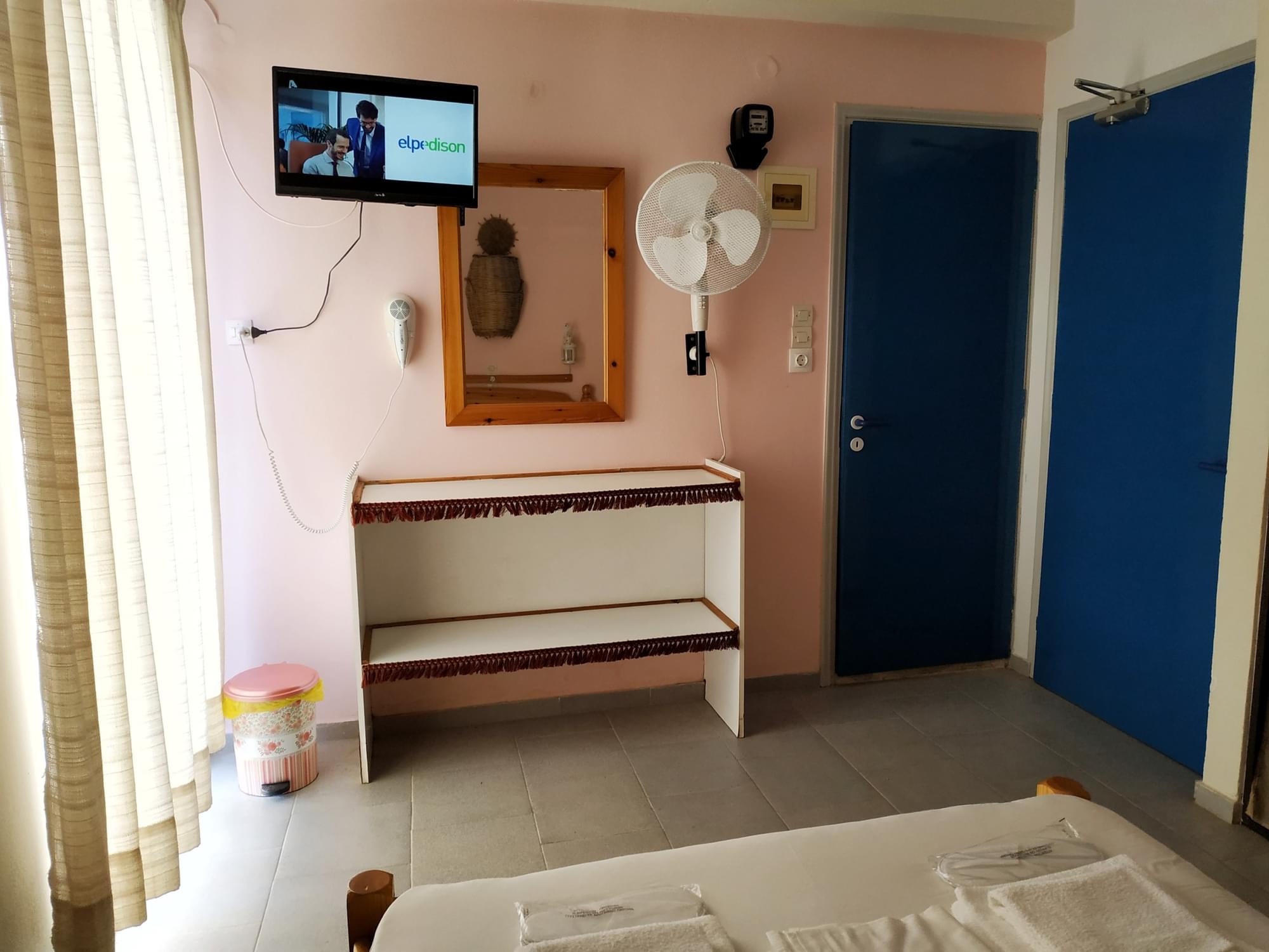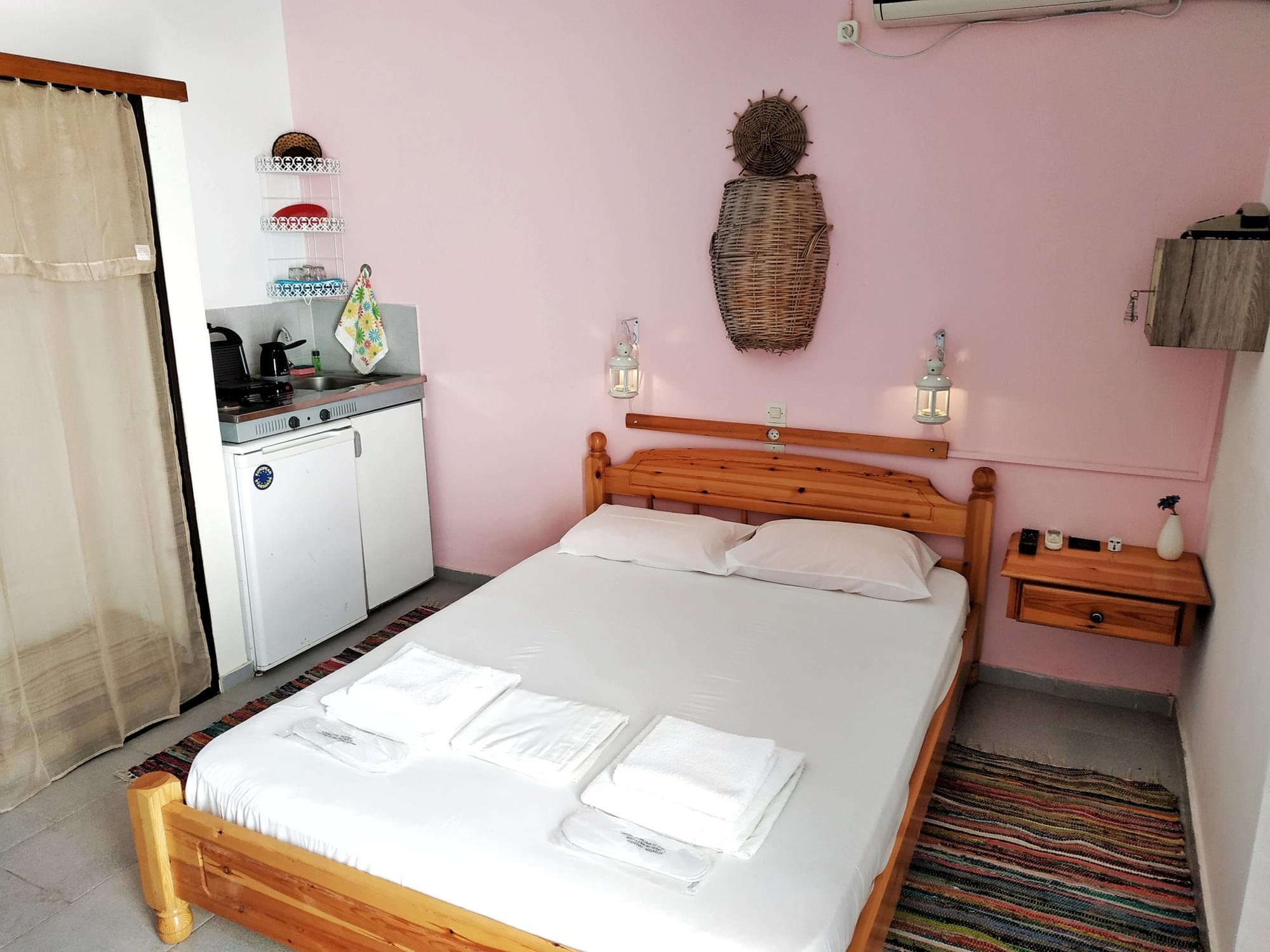 You can heat/cool the room with the air condition or the fan (in summer) or for more healthy you can just leave open the doors and let in the fresh air. The room is decorated with traditional Greek island style. In the room is a king size bed and other facilities as help desk, bedside table and closet.