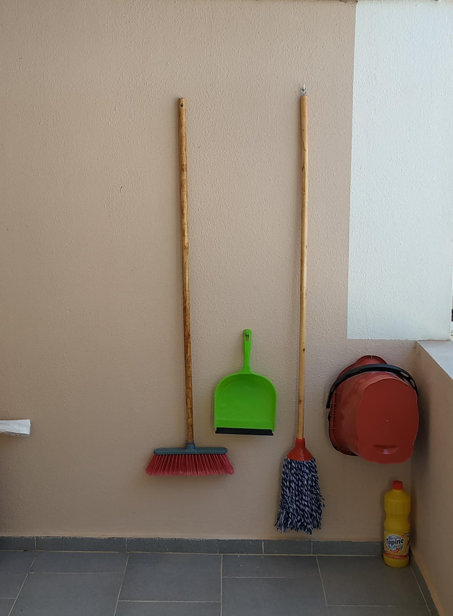 At your balcony also you may find cleaning facilities (broom, dust pan, mop, mop bucket, clorine for the floor).