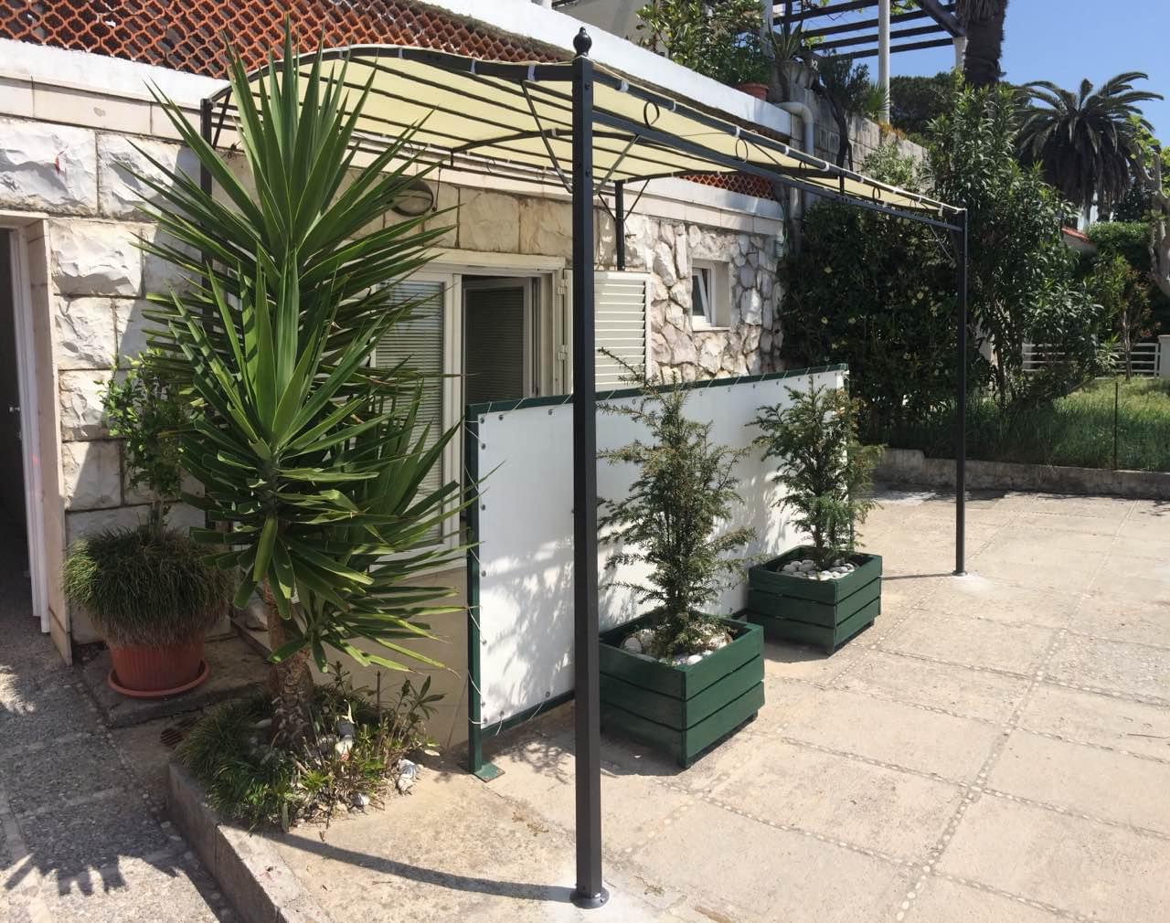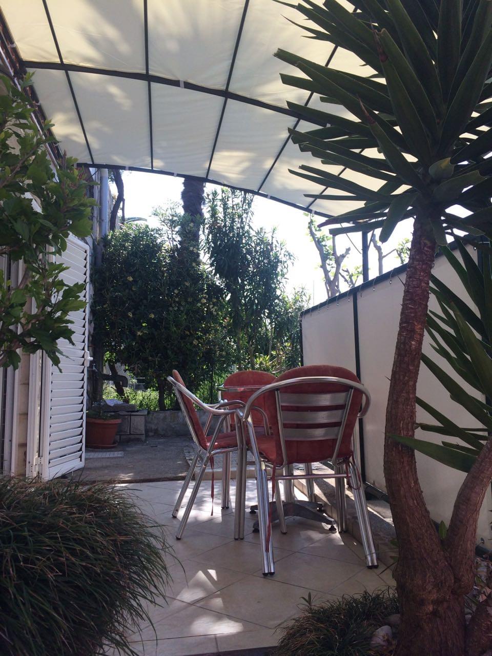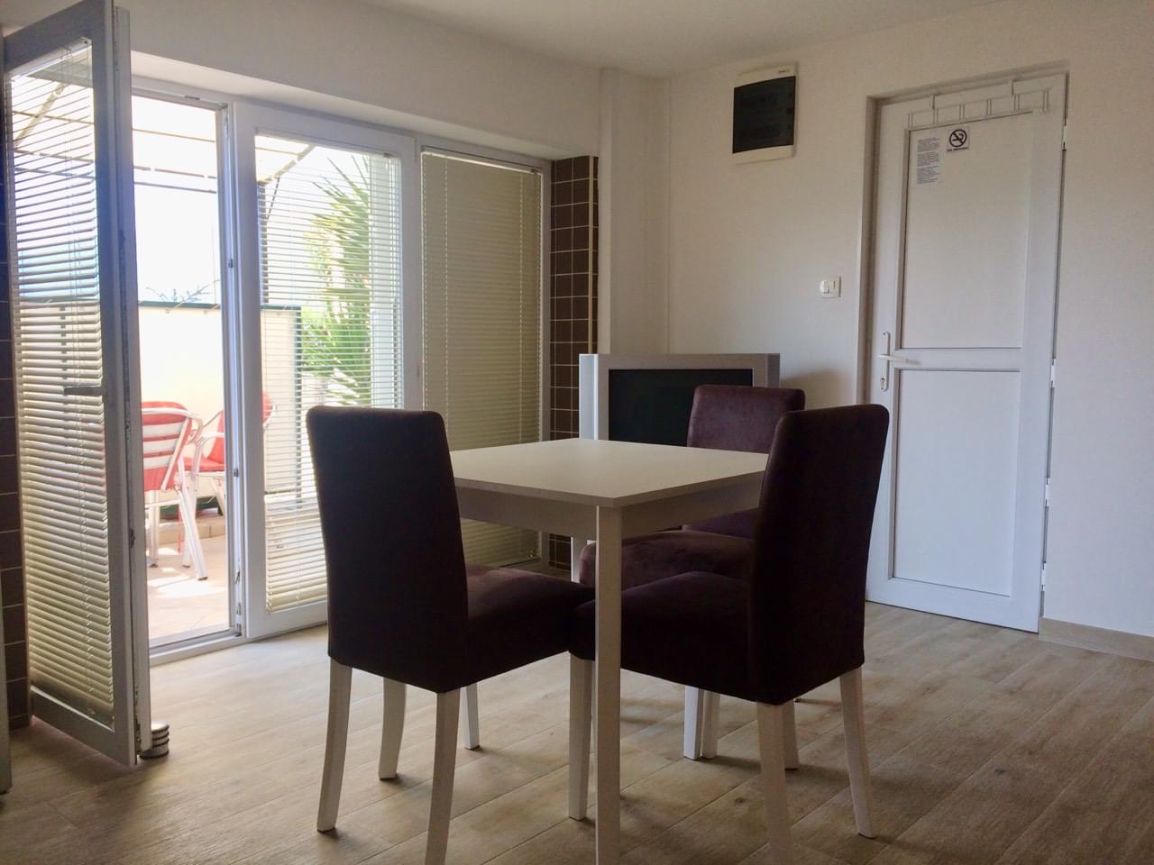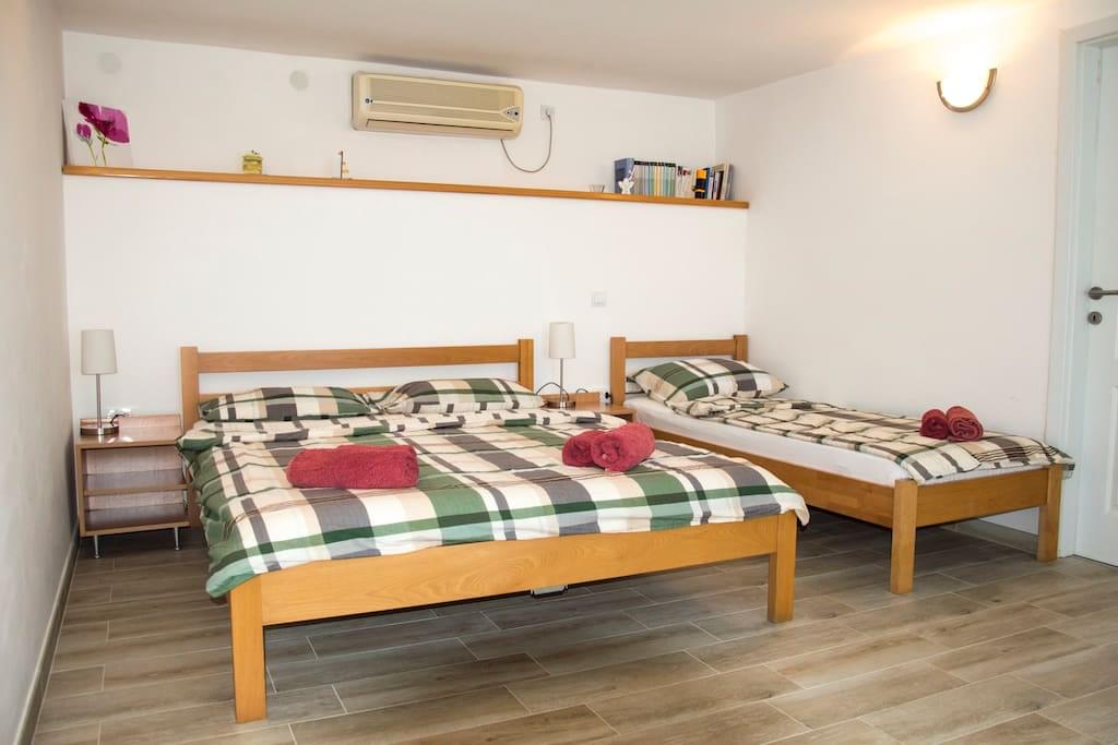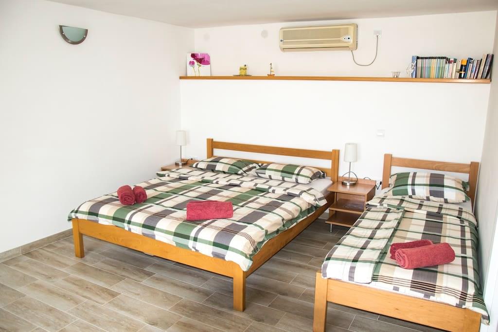 Trokrevetni studio , površine 30m2 smješten je u prizemlju kuće i ima terasu sa pogledom na more. Apartman je klimatizovan, sa kompletno opremljenom kuhinjom (frižider/zamrzivač,mikrotalasna pećnica, toster, čajnik – “kettle”), svojim kupatilom (veš mašina, fen za kosu) TV, DVD (filmovi obezbjeđeni), knjige, bežični Internet. S obzirom da nema stepenica apartman je pogodan za osobe sa ograničenom pokretljivošću.