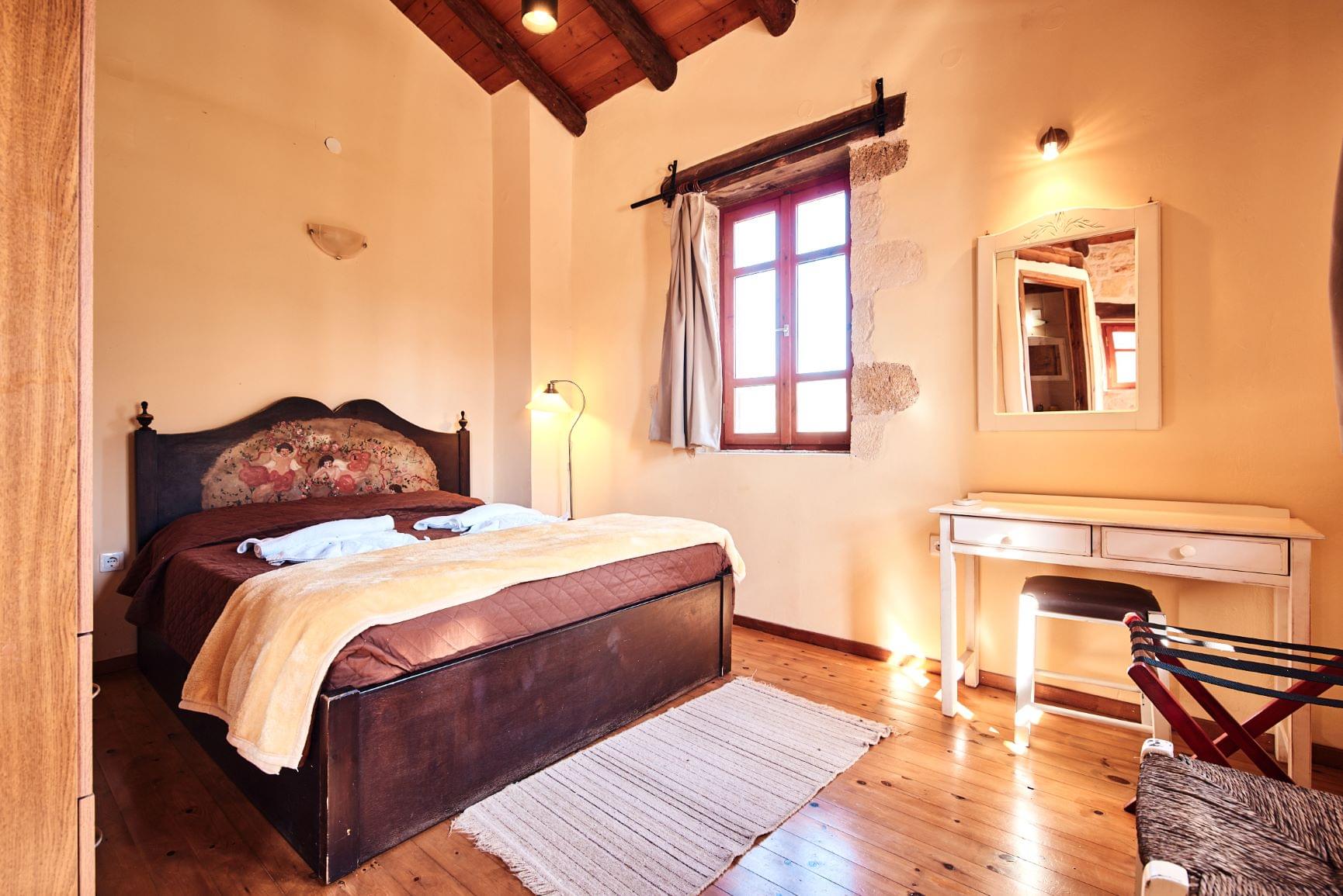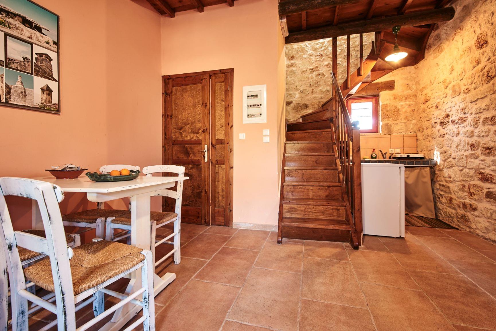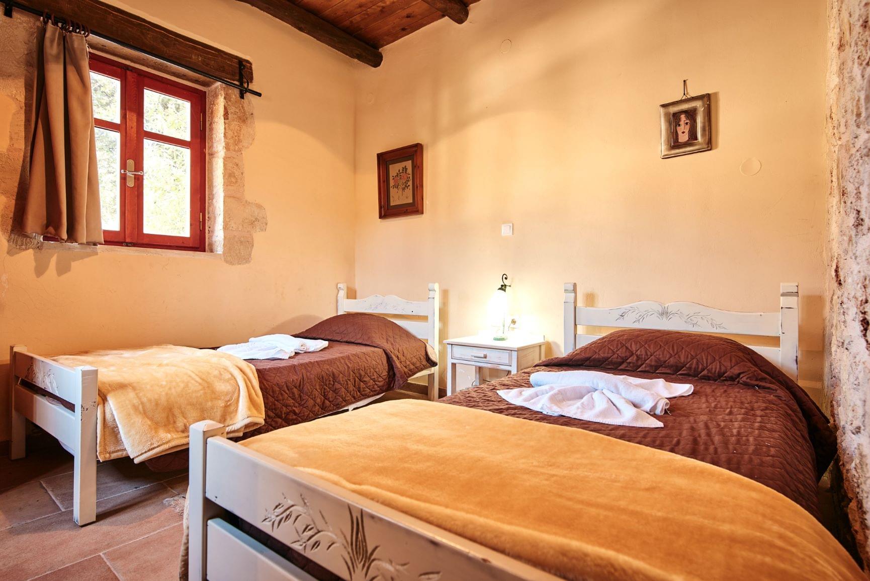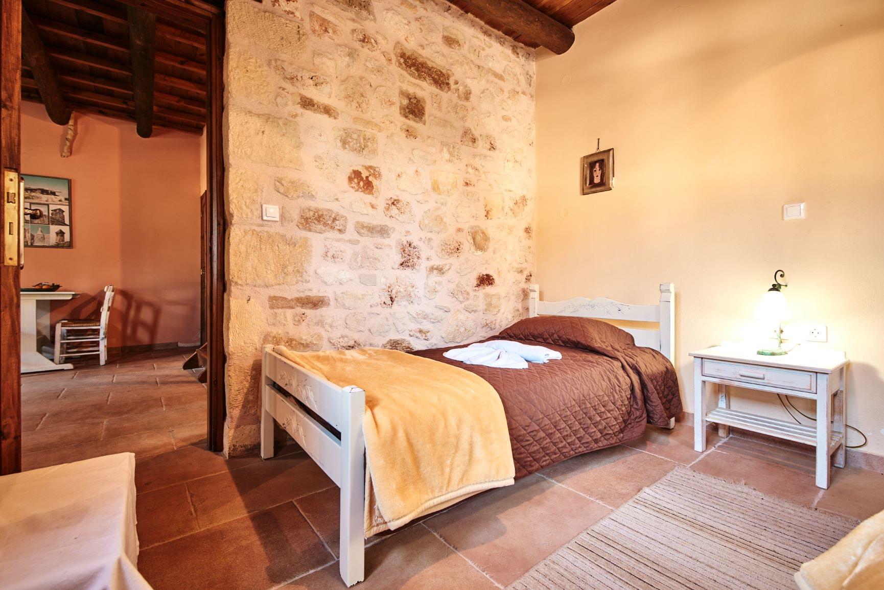 Our traditional guesthouses provide a warm and cozy atmosphere with selected natural materials, like domestic stone and wood. The furniture is in traditional style and the wooden ceiling is perfecting the country style. On the ground floor you will find the spacious living room with a fireplace and a fully equipped kitchenette. There is also a homey bedroom with two single beds and a bathroom with shower. Upstairs you will find the master bedroom with a double bed and a private bathroom with a bathtub, while the private balcony offers view to the olive grove and/or stone-built amphitheater . Mini fridge, TV, air conditioning, free WiFi, toiletries and bedding are included.