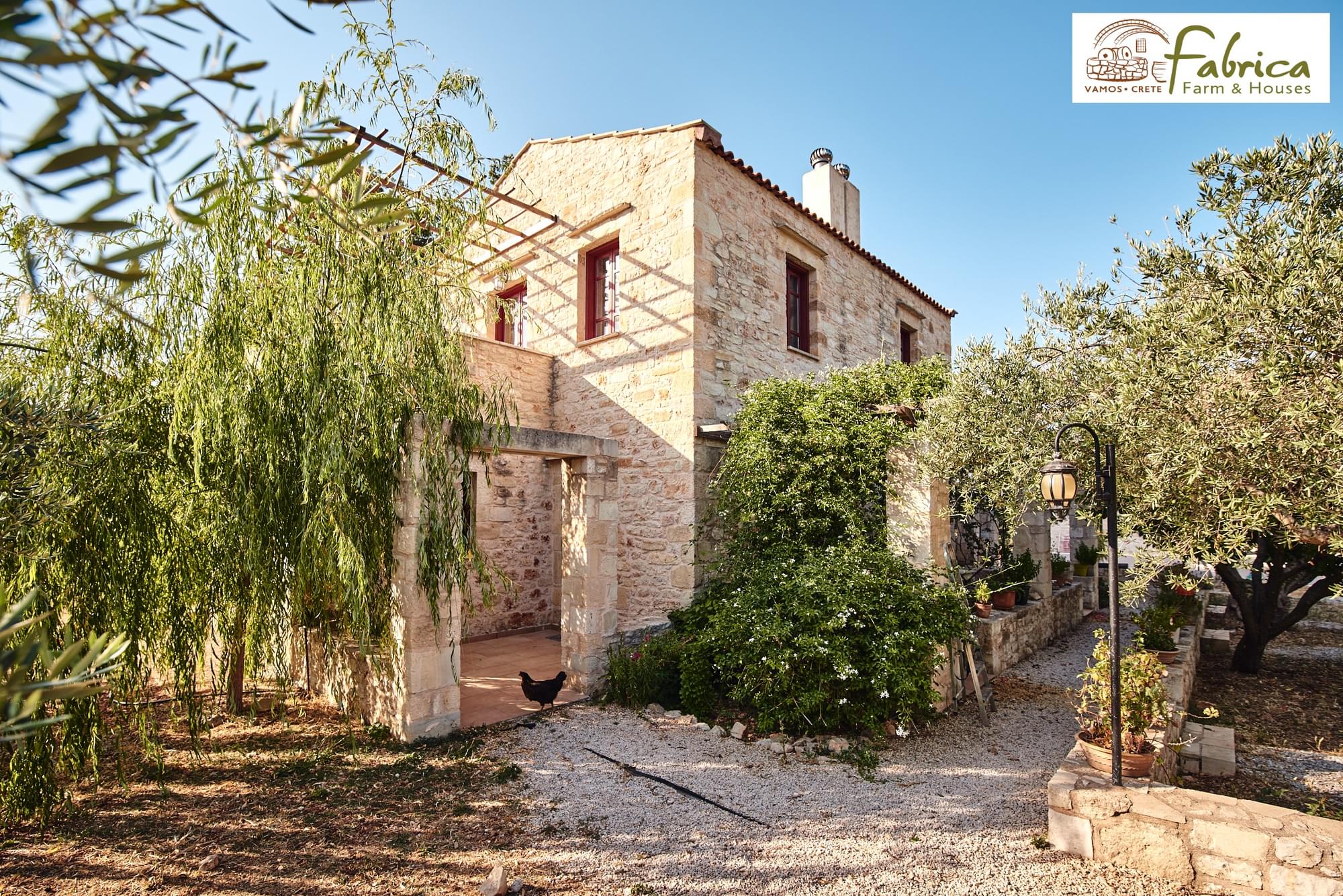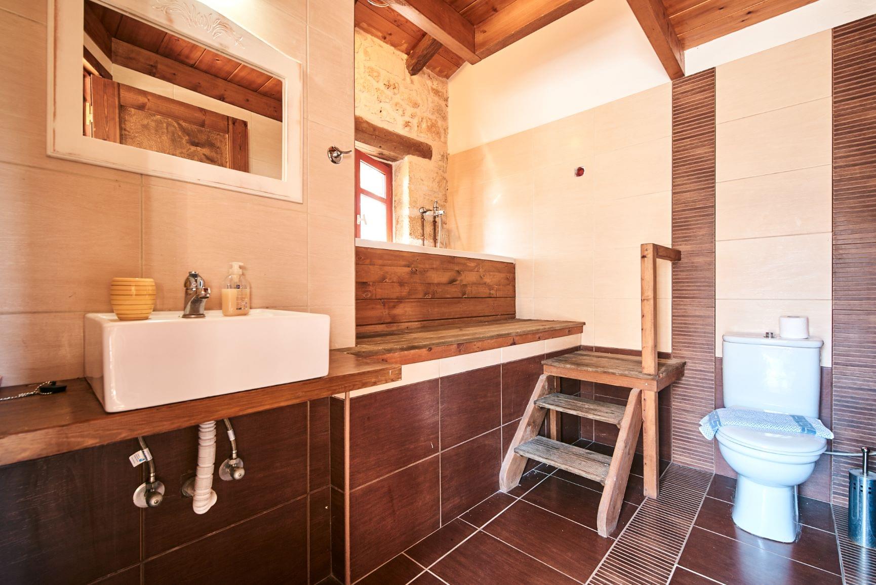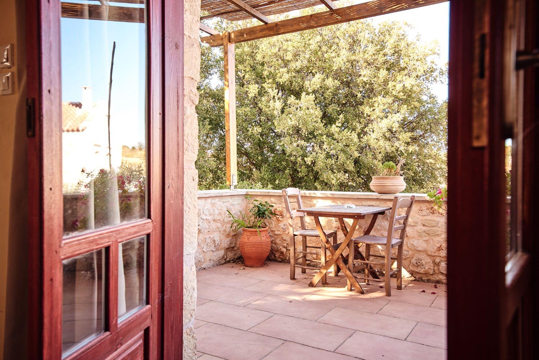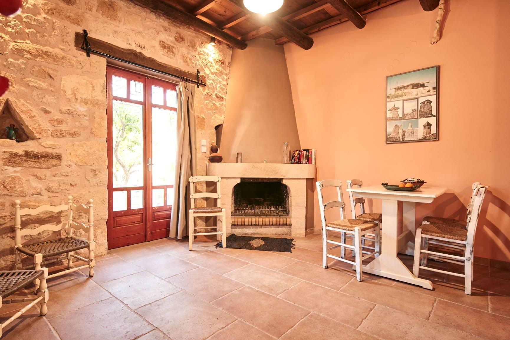Our traditional guesthouses provide a warm and cozy atmosphere with selected natural materials, like domestic stone and wood. The furniture is in traditional style and the wooden ceiling is perfecting the country style. On the ground floor you will find the spacious living room with a fireplace and a fully equipped kitchenette. There is also a homey bedroom with two single beds and a bathroom with shower. Upstairs you will find the master bedroom with a double bed and a private bathroom with a bathtub, while the private balcony offers view to the olive grove and/or stone-built amphitheater . Mini fridge, TV, air conditioning, free WiFi, toiletries and bedding are included.