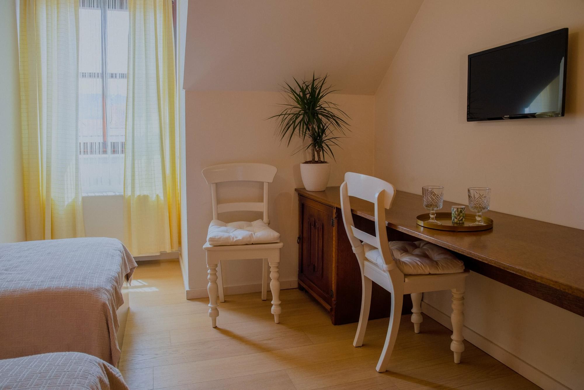 Two single beds with the view on the south town center and green hills from behind. Private bathroom.