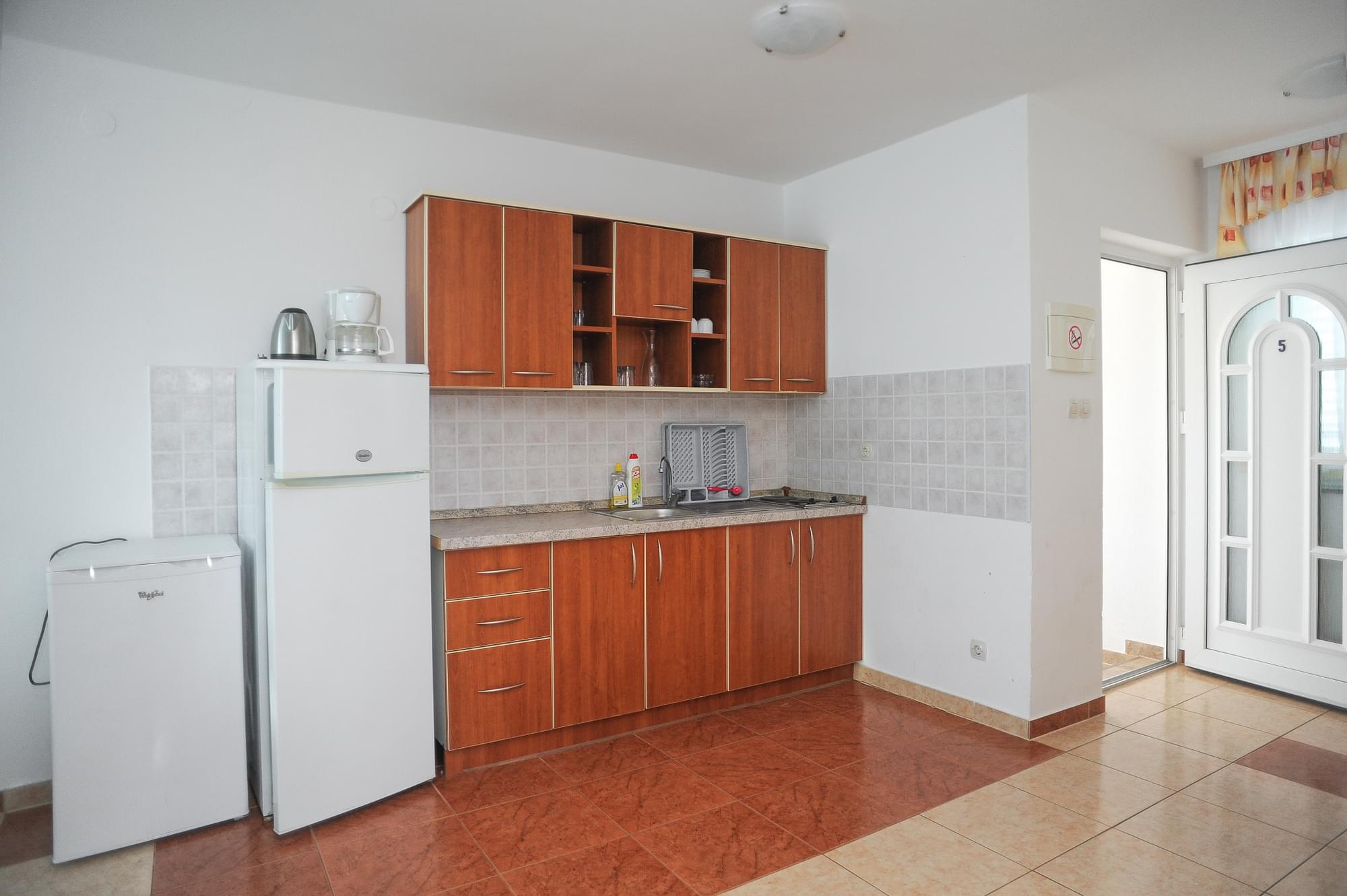 Located on the first floor of the building, apartment 5 for 6 persons consists of two separate bedrooms, a fully equipped kitchen with a dining area, a living room, and a bathroom. The apartment has its own terrace overlooking the sea and the landscape. The apartment has access to a swimming pool and an outdoor terrace, and it’s available free parking. Wi-Fi is available in the apartment at an additional cost. The surface area of the apartment is 60 m2