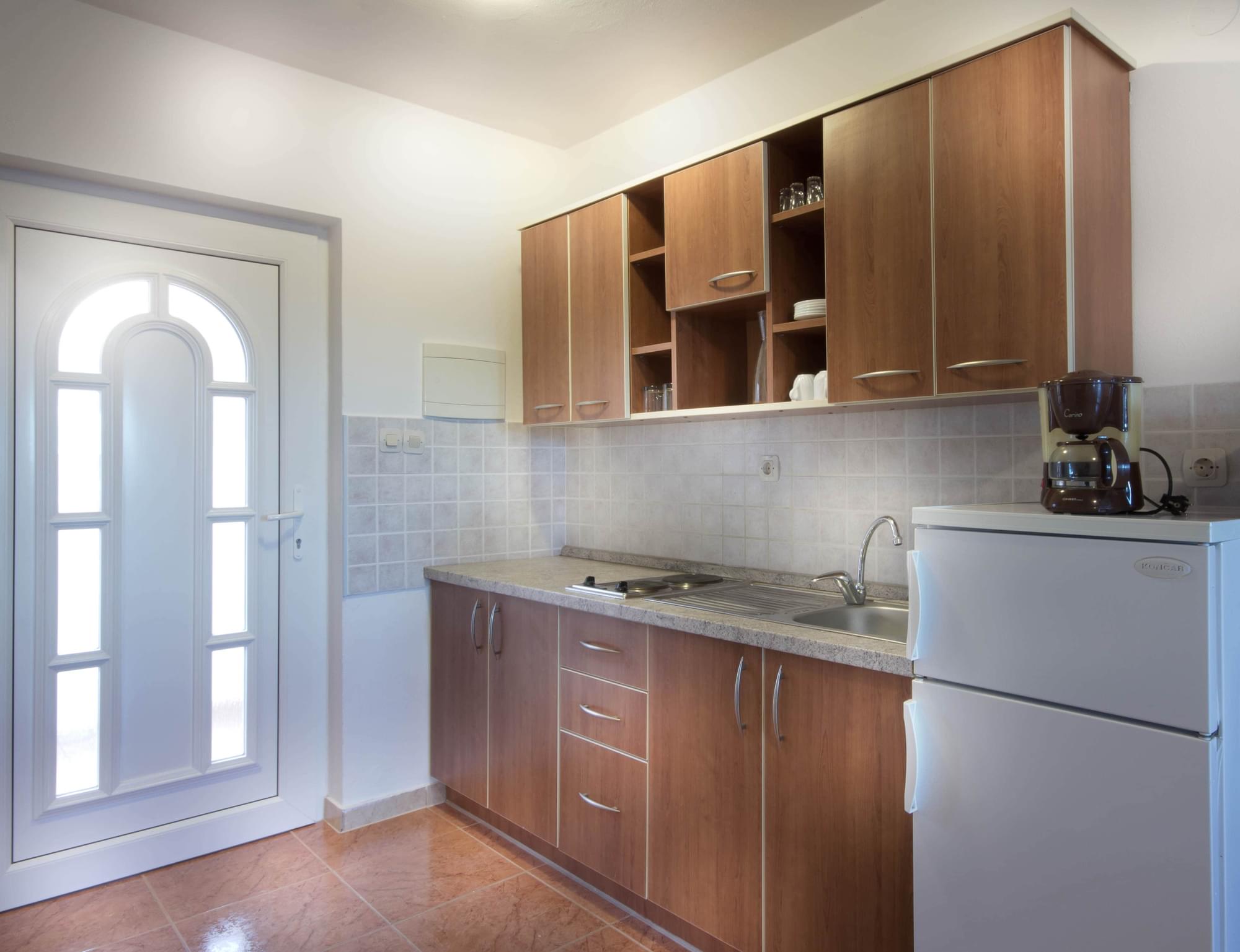 Located on the ground floor of the building, the studio apartment 3 for 2 people consists of a fully equipped kitchen with a dining area and a bedroom in one room, and a bathroom in a separate room.The apartment has its own terrace overlooking the sea and the landscape. The apartment has access to a swimming pool and an outdoor terrace, and it’s available free parking. Wi-Fi is available in the apartment at an additional cost. The surface area of the apartment is 27 m2