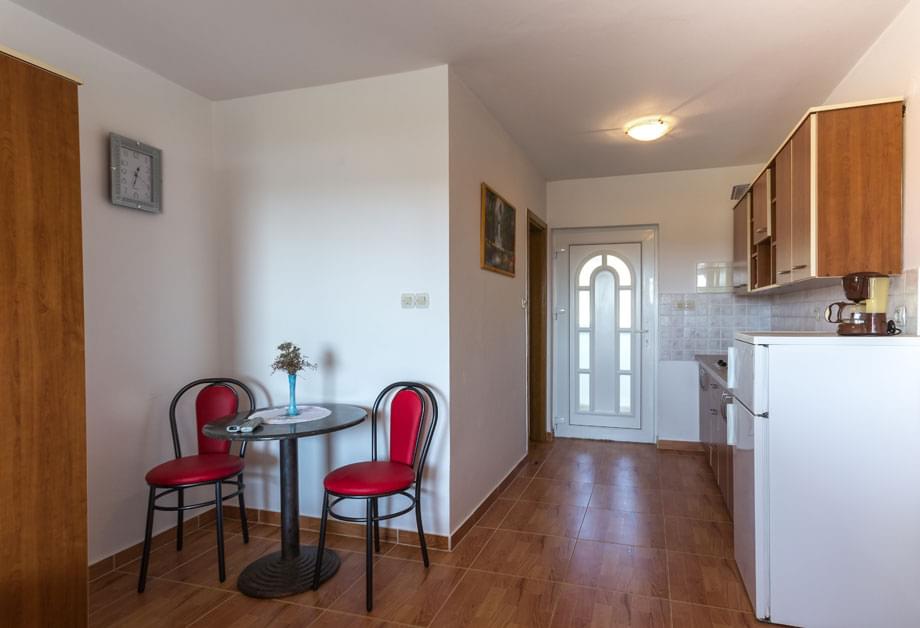 Located on the ground floor of the building, the studio apartment 7 for 2 people consists of a fully equipped kitchen with a dining area and a bedroom in one room, and a bathroom in a separate room.The apartment has its own terrace overlooking the sea and the landscape. The apartment has access to a swimming pool and an outdoor terrace, and it’s available free parking. Wi-Fi is available in the apartment at an additional cost. The surface area of the apartment is 27 m2