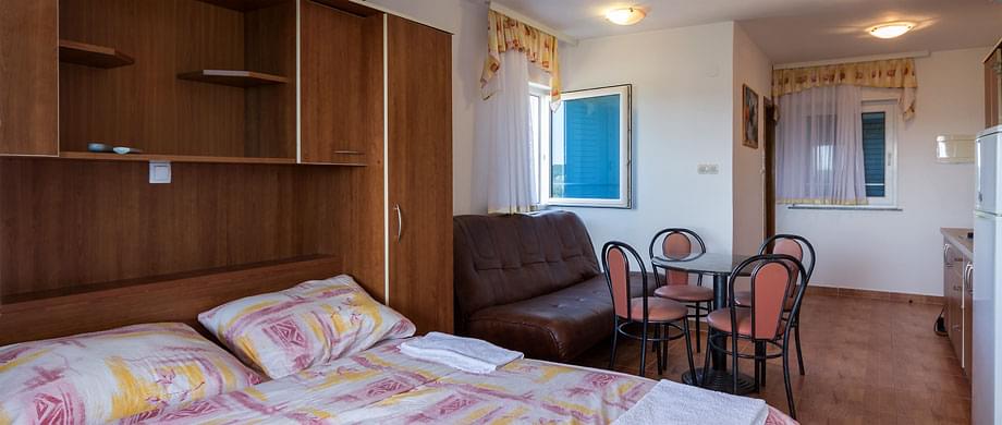 Located on the ground floor of the building, the studio comfort apartment 4 for 4 People consists of a fully equipped kitchen with a dining area, a living room and a bedroom in one room, and a private bathroom.The apartment has its own terrace overlooking the sea and the landscape. The apartment has access to a swimming pool and an outdoor terrace, and it’s available free parking. Wi-Fi is available in the apartment at an additional cost. The surface area of the apartment is 40 m2