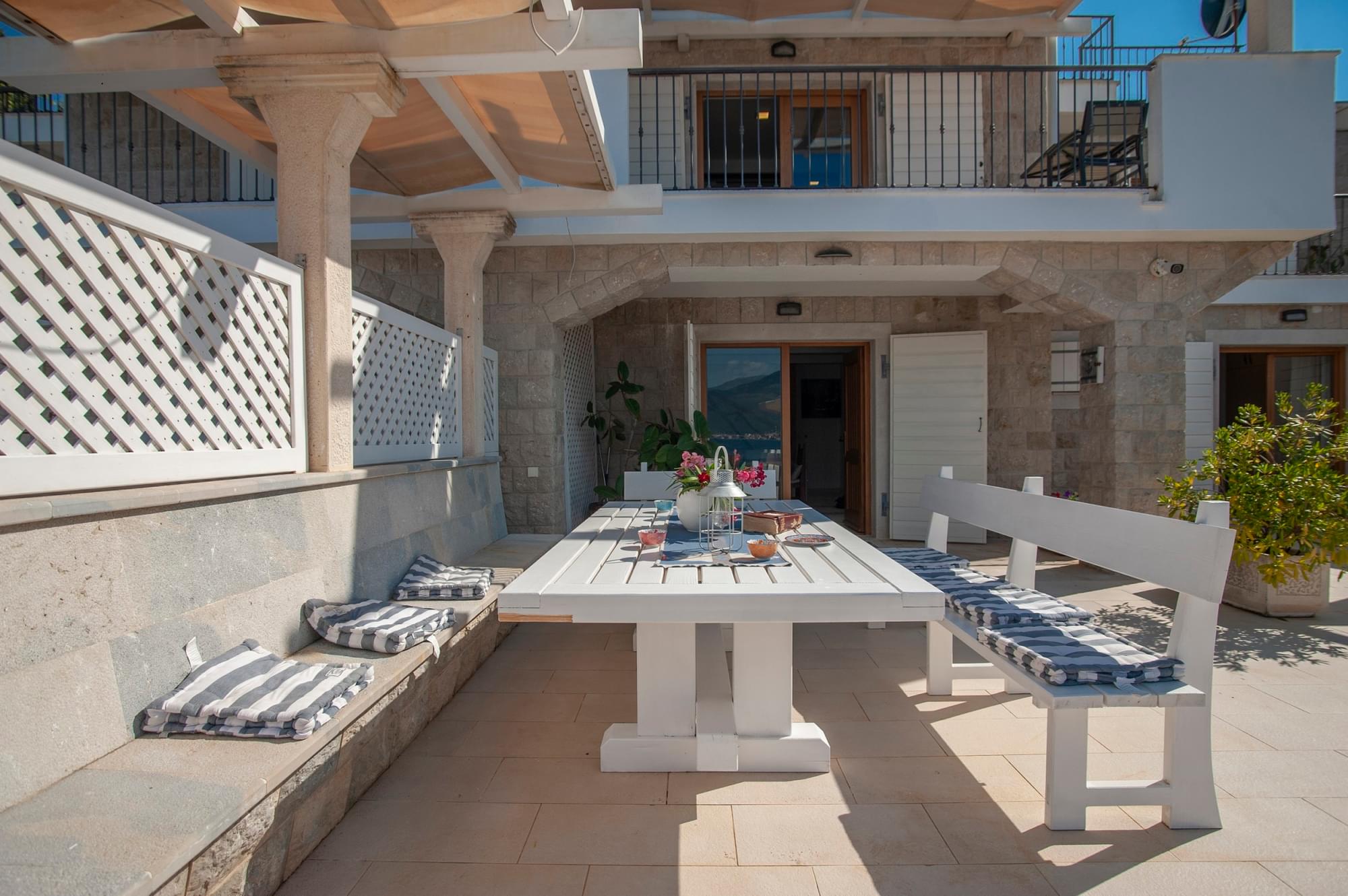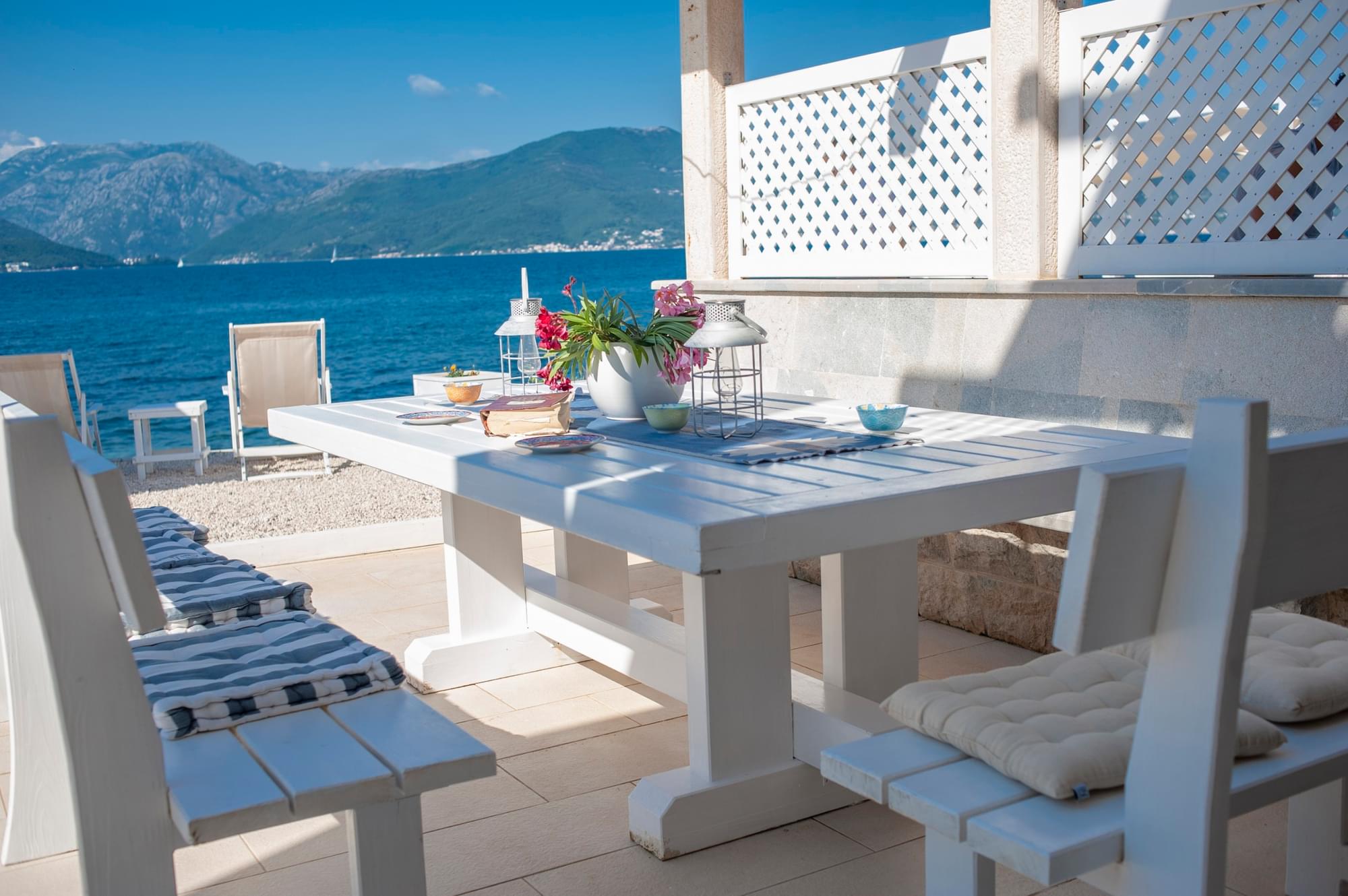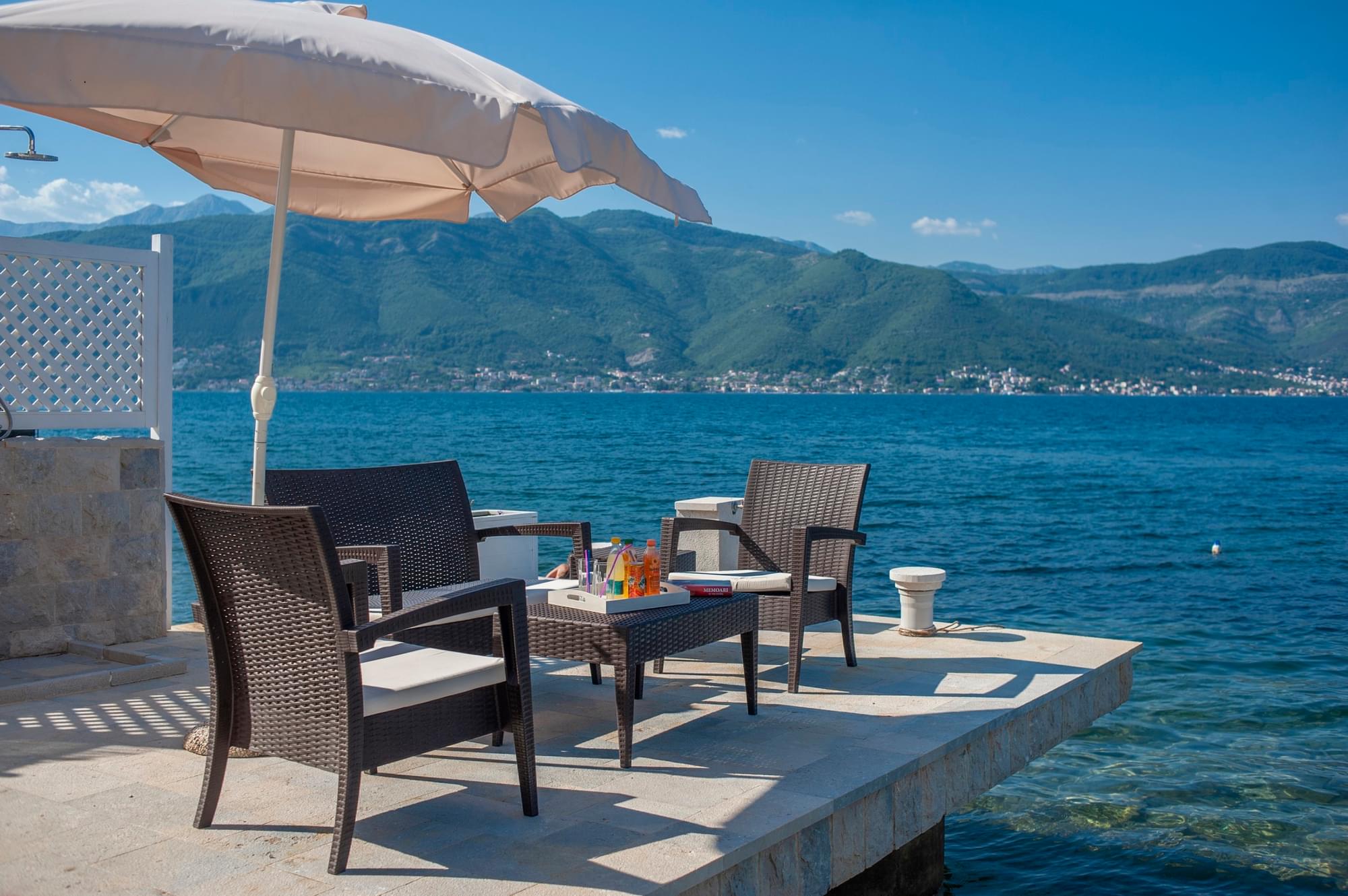 The villa is situated on the very coast. It is 180 sq.meters big and can accommodate 9 people. It consists of three bedrooms, three bathrooms, sauna, private terrace, private beach and barbecue area. It is equipped with internet, cable TV, washing machine, dryer, dishwasher and a microwave oven as well as complete dishes. The use of toiletries and towels is included in the price. Free parking is available. If you book our accommodation for 7 or more days, you will get a free boat ride through the beautiful Bay of Kotor and the bay of Zanjice.