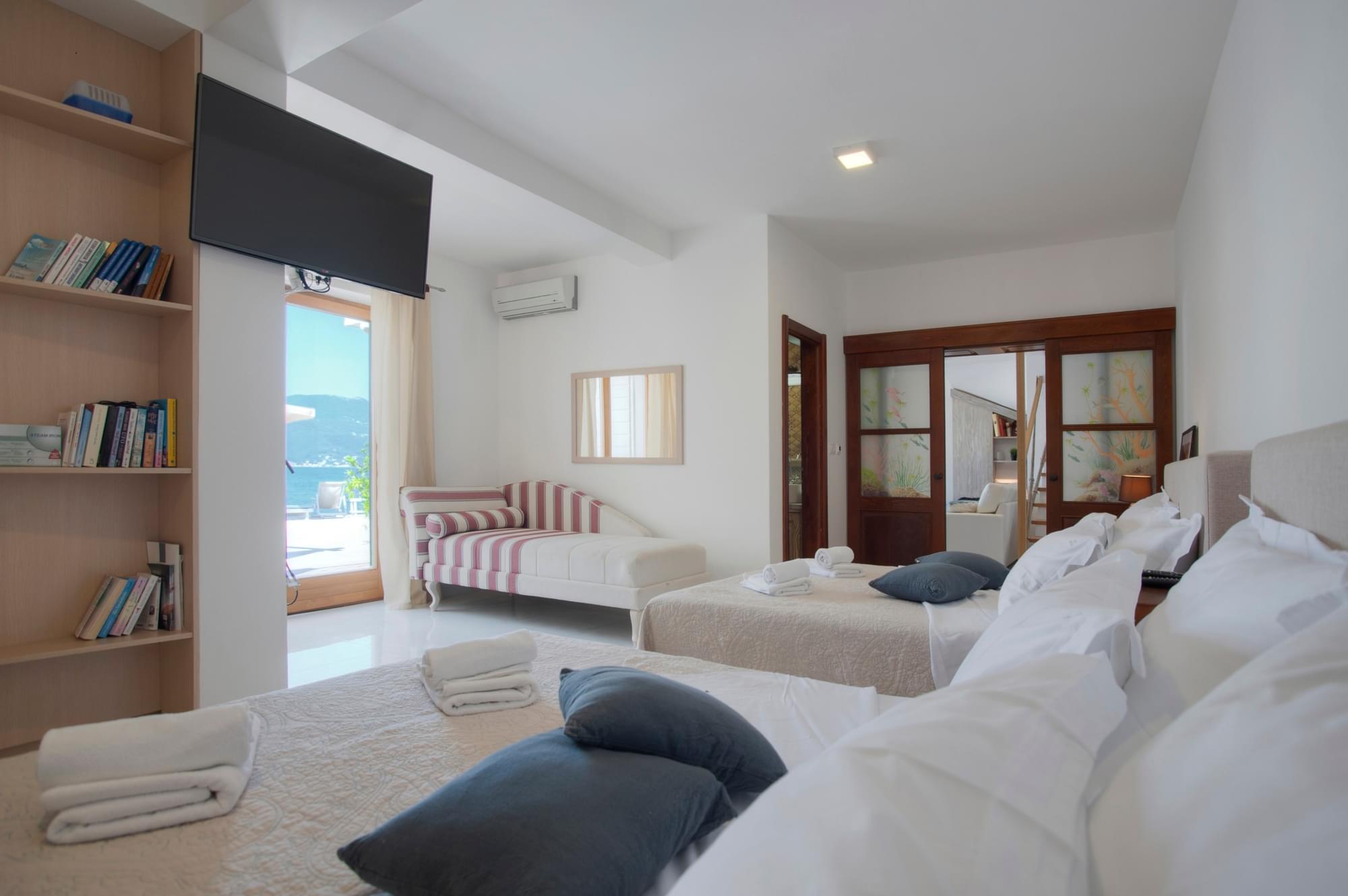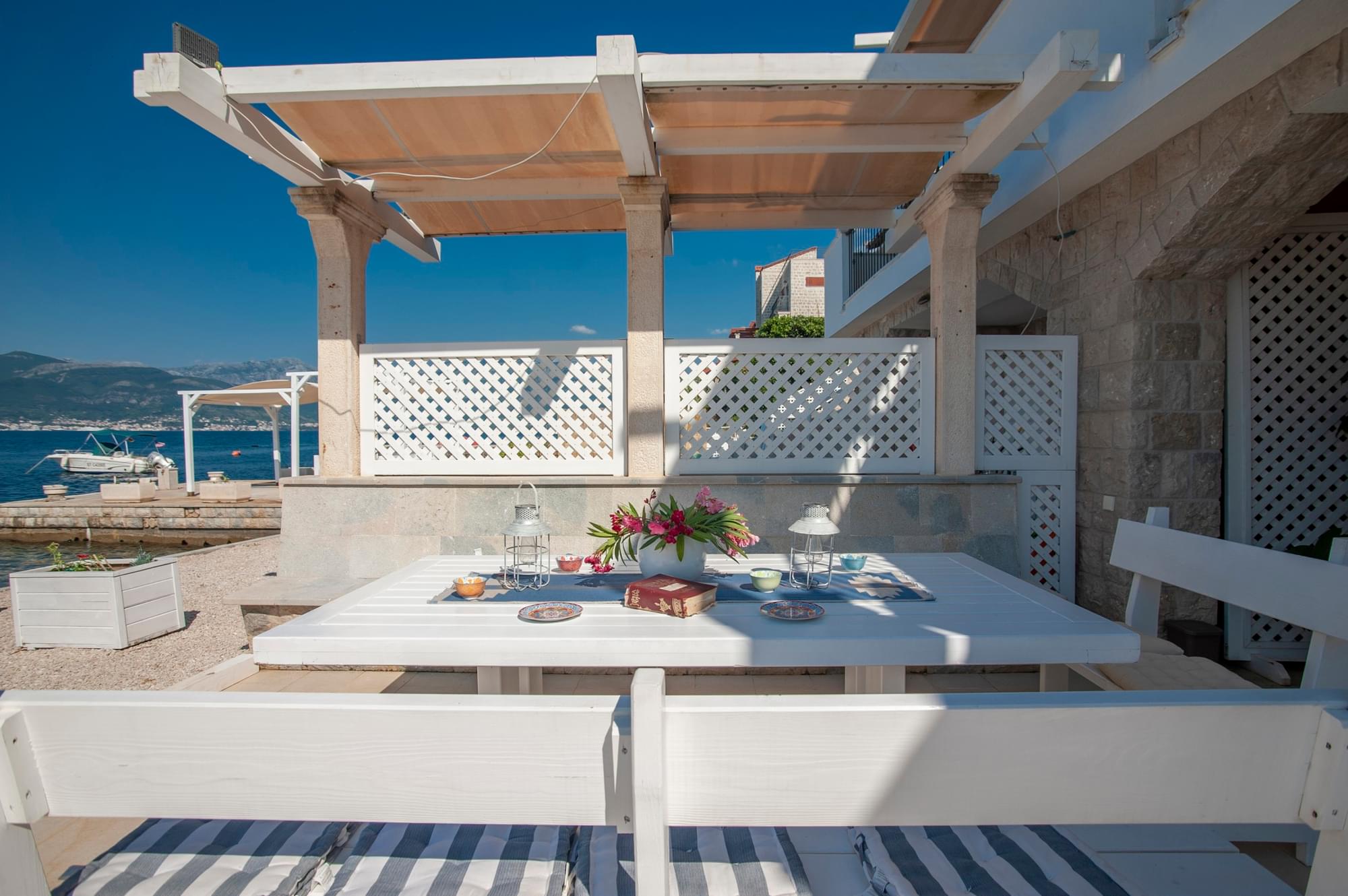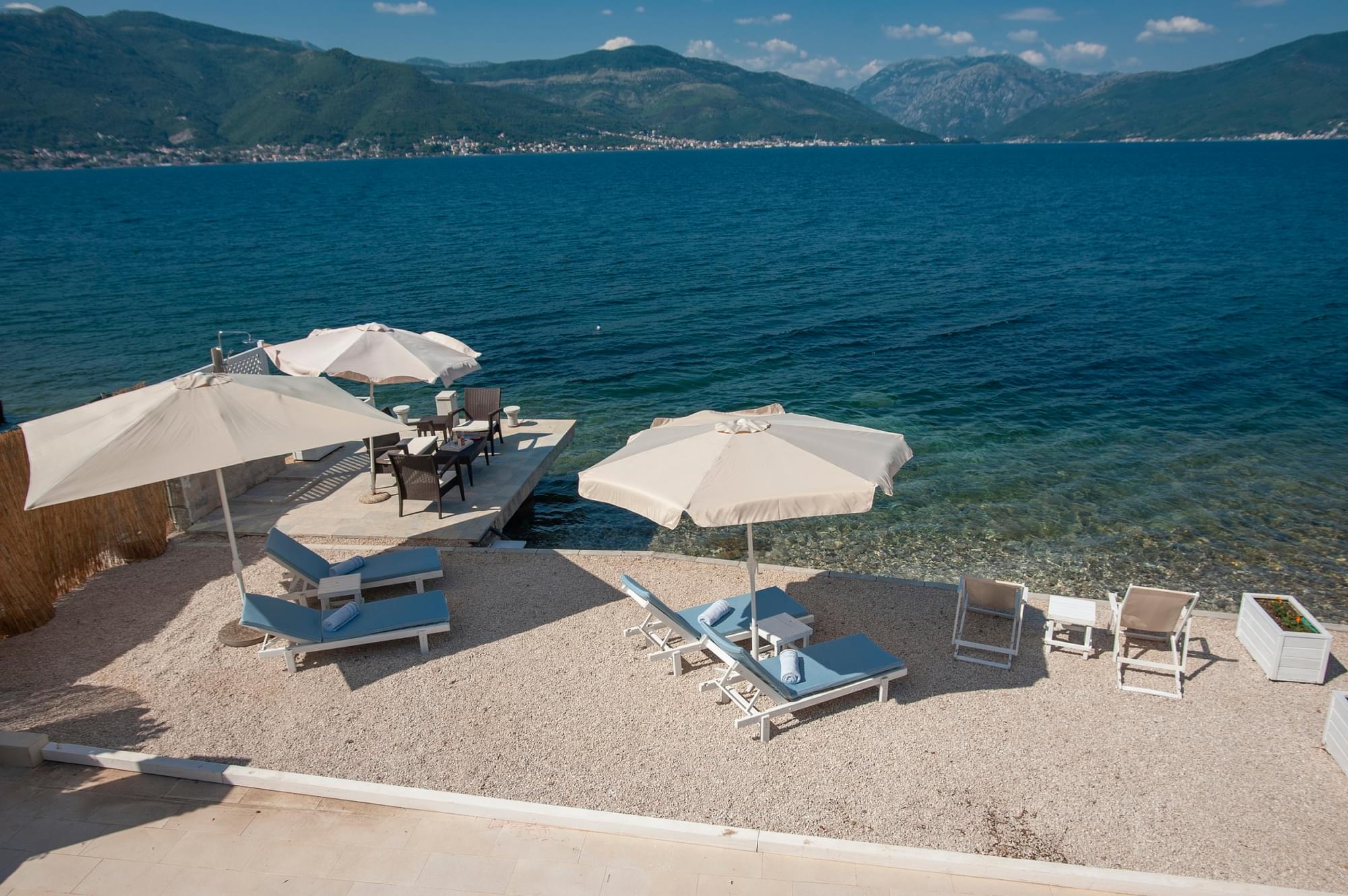 The villa is situated on the very coast. It is 180 sq.meters big and can accommodate 9 people. It consists of three bedrooms, three bathrooms, sauna, private terrace, private beach and barbecue area. It is equipped with internet, cable TV, washing machine, dryer, dishwasher and a microwave oven as well as complete dishes. The use of toiletries and towels is included in the price. Free parking is available. If you book our accommodation for 7 or more days, you will get a free boat ride through the beautiful Bay of Kotor and the bay of Zanjice.