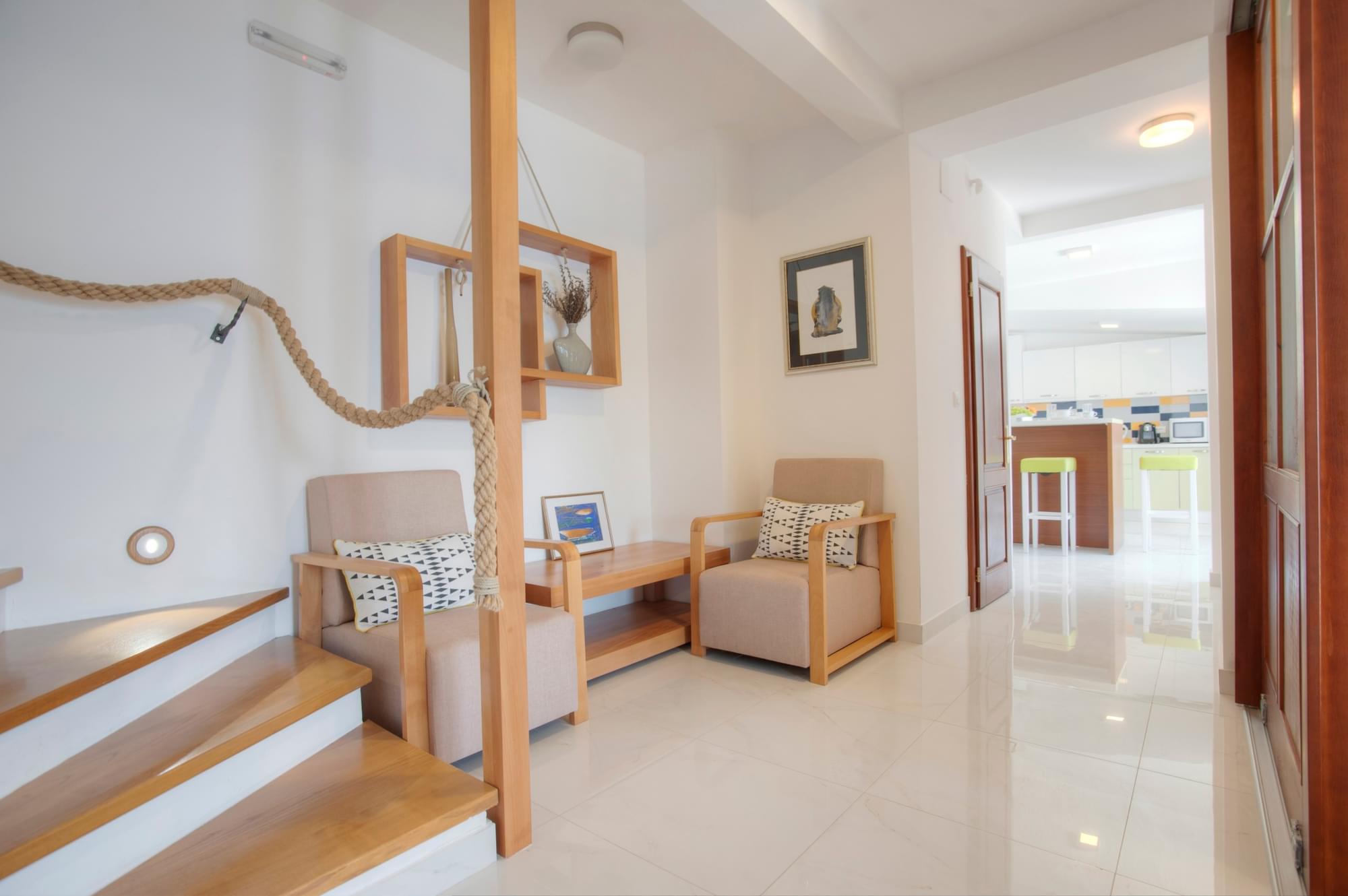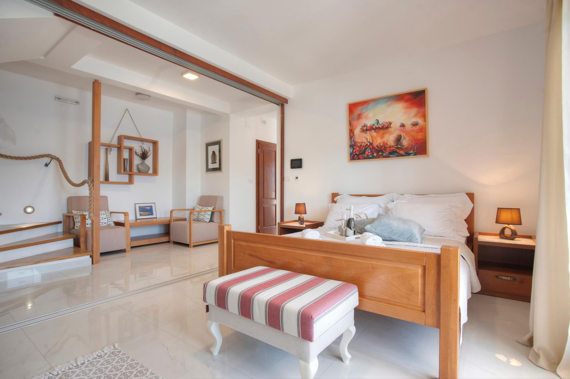 Vila se nalazi na samoj obali mora. Površine je 180m2 i prima 9 osoba. U svom sastavu ima tri spavaće sobe, tri kupatila, saunu, privatnu tarasu, privatnu plažu i prostor za roštilj. Opremljena je internetom, kablovskom televizijom, mašinom za pranje i sušenje veša, mašinom za pranje suđa, mikrotalasnom pećnicom, kao i kompletnim posuđem. Upotreba toaletnog pribora i peškira je uključena u cijenu.