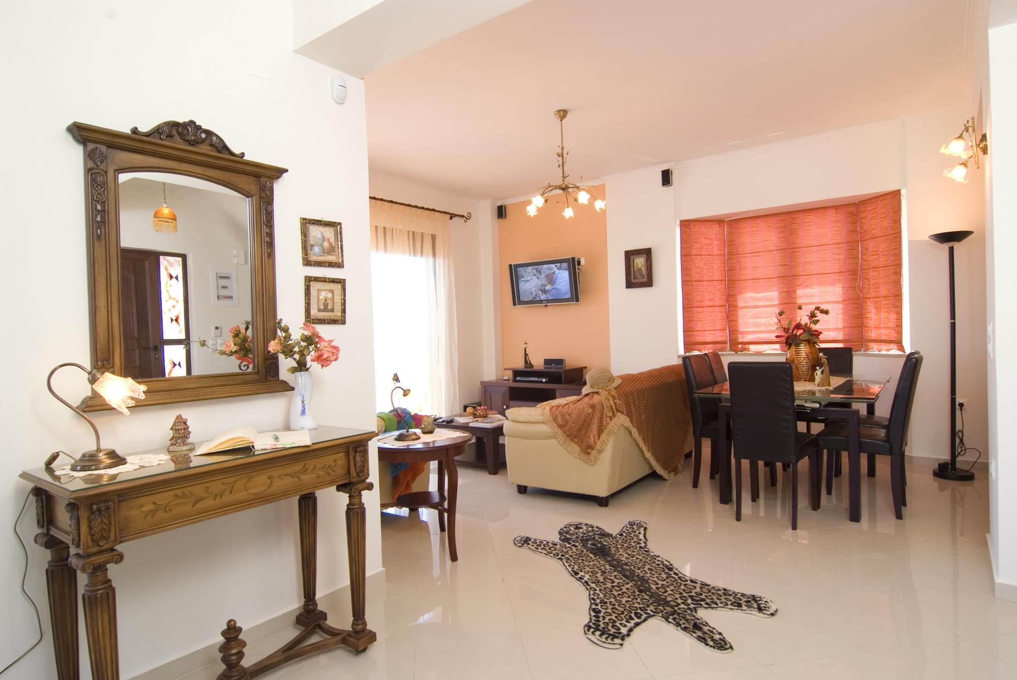 In the upper floor, there’s the Master Bedroom with en suite WC and Shower room. Additionally, there’s a second bedroom with two single beds and a large bathroom with jacuzzi. Both bedrooms share a balcony facing the Bay and Akrotiri peninsula.