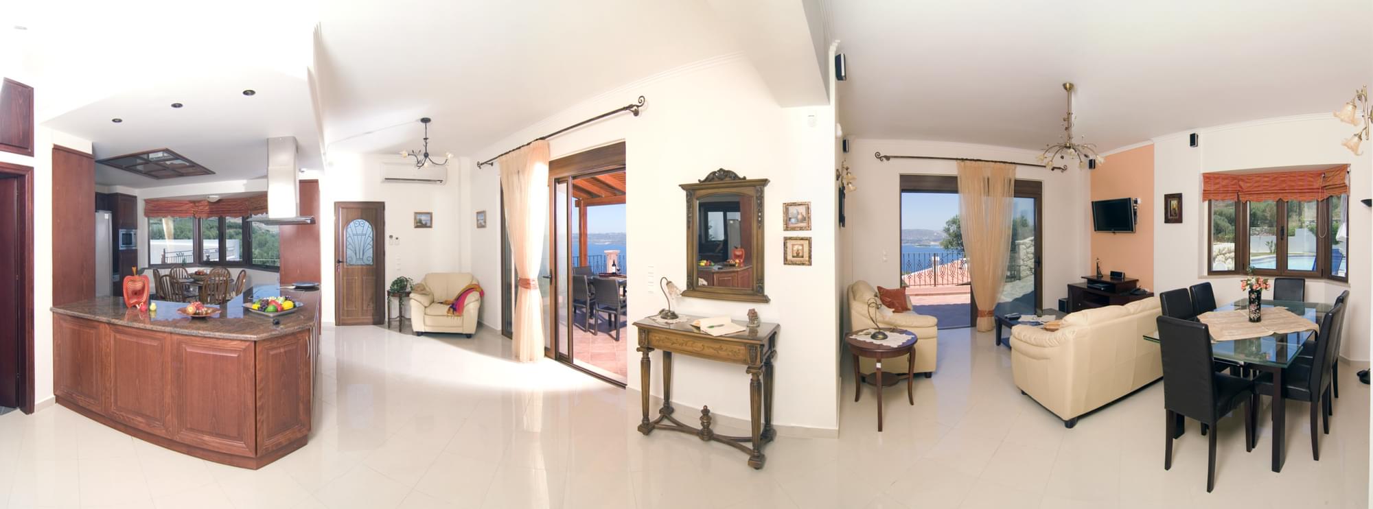 The villa is extended to three levels. In the main level, you will find the Living Room, Dining Room and the fully equipped kitchen. The very large balcony of the main level, in addition to offering breathtaking views of the Bay, leads to the salty water pool and surrounding garden.