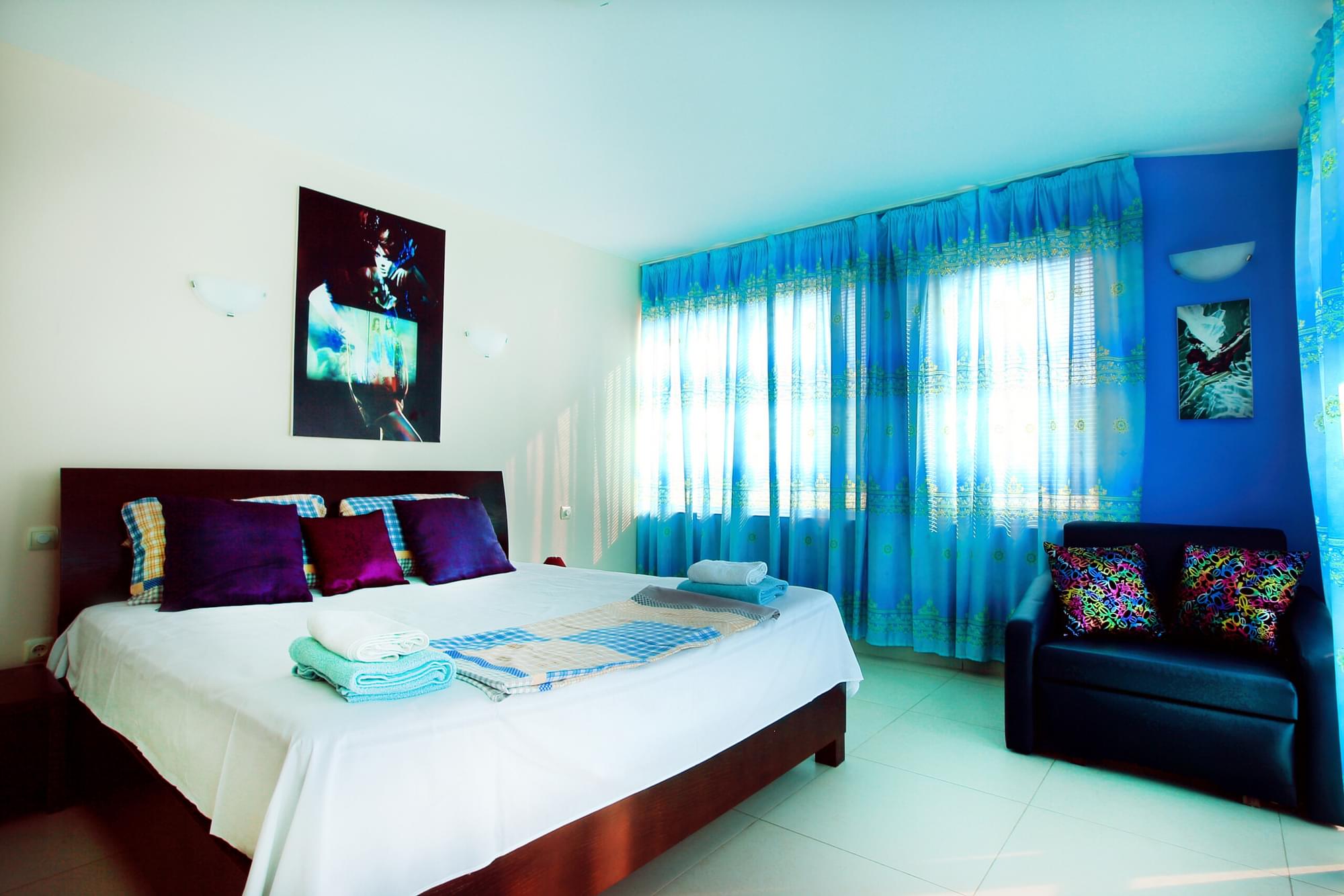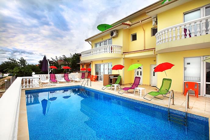 Villa Emloti Art-Decor and Fashion Boutique, Balchik. Extremely large luxury villa with full sea view and private location. 3 floors, 465 sq.m, 6 bedrooms with private (built-in) bathrooms, 2 living rooms, 2 kitchens, cable TV + wifi + music devices, full equipment, original design, stunning large sea view, swimming pool, 2 garages. Location: village zone Izgrev, Balchik. Rent from 300 eu for low season and from 350 eu for high season.