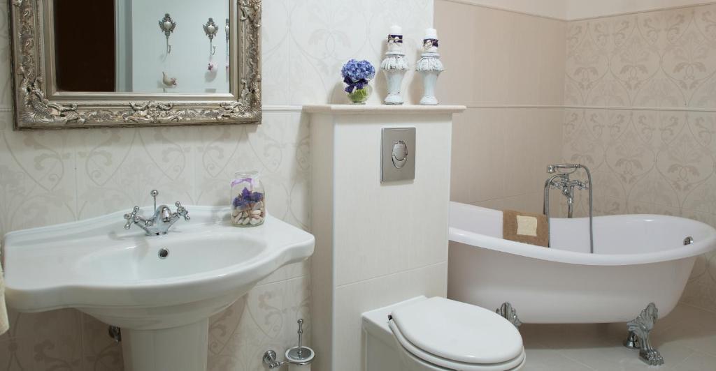 The living area is elegantly decorated in soft neutral shades and tasteful antique furnishings.