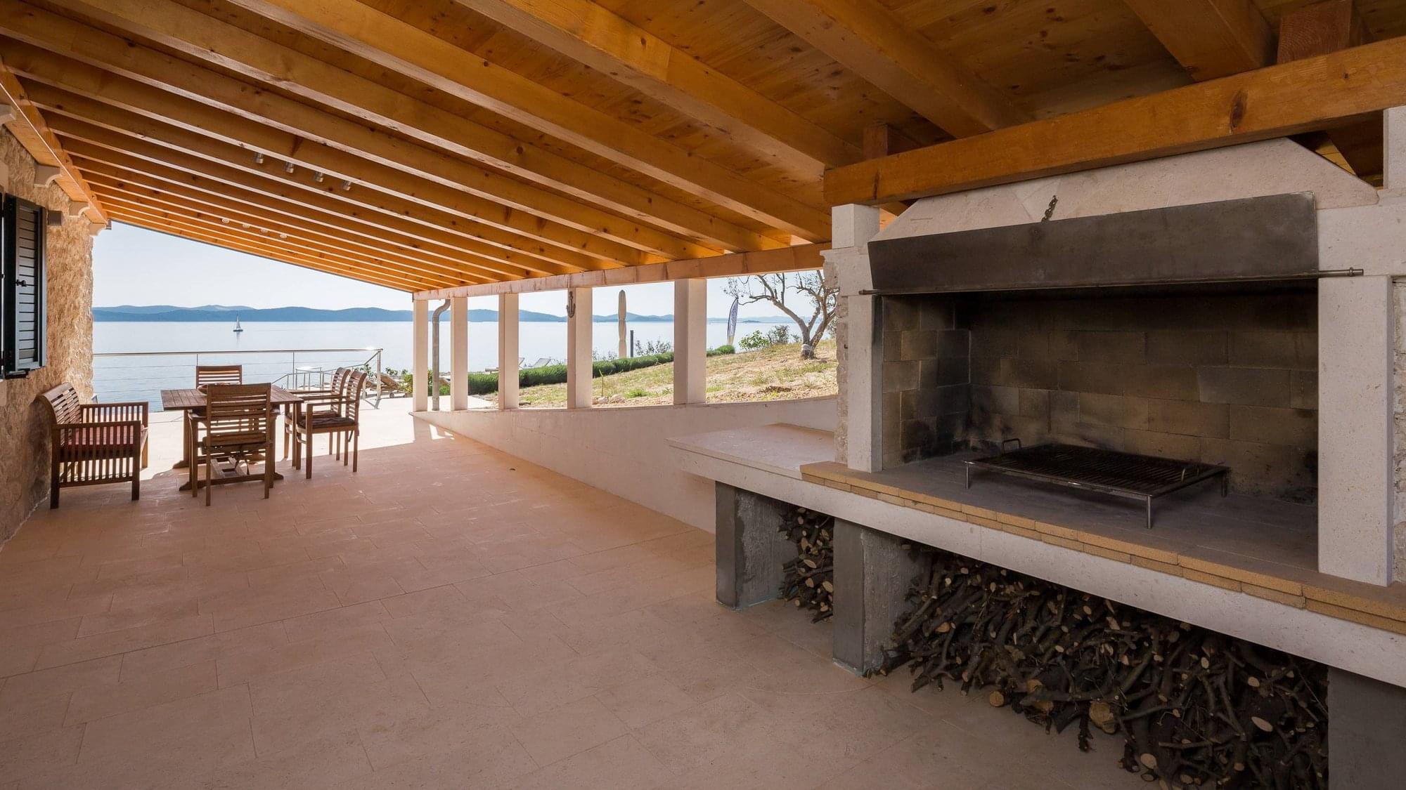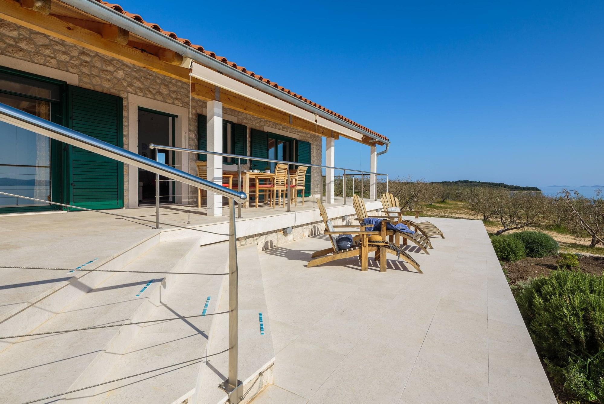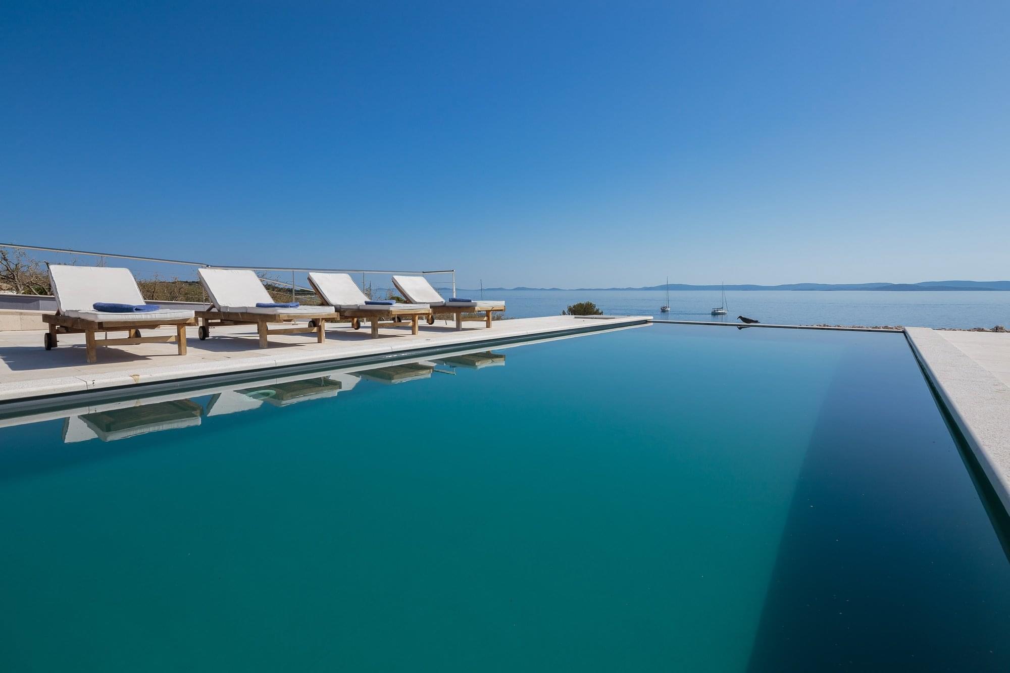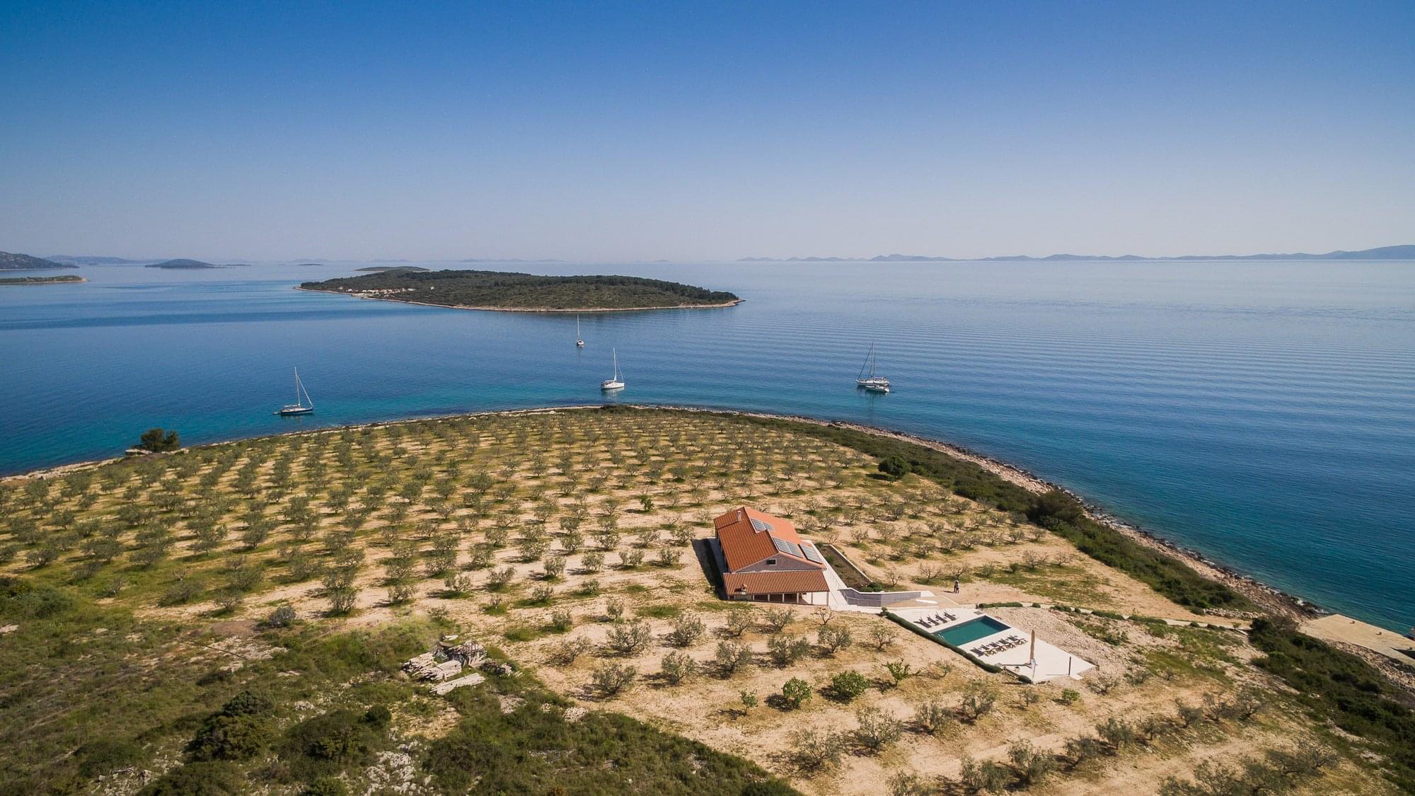 The villa is built on a 47.500 m² private olive orchard, on an island. It has 580 m private beach and a 4x10m infinity line swimming pool. It is surrounded by 300 m2 terraces, all with sea view. On one of the terraces is a huge BBQ.